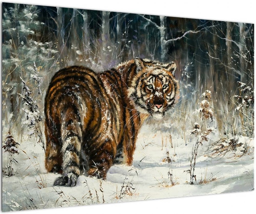 Obraz - Tygr v zasněženém lese, olejomalba, jednodílný 90x60 cm