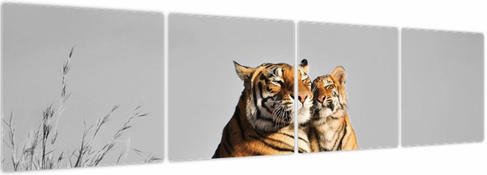 Obraz - Tygřice a její mládě, černobílá varianta, Čtyřdílný 160x40 cm