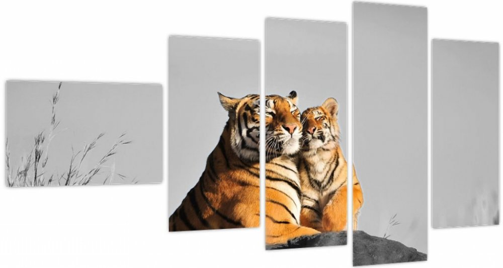 Obraz - Tygřice a její mládě, černobílá varianta, pětidílný 110x60 cm