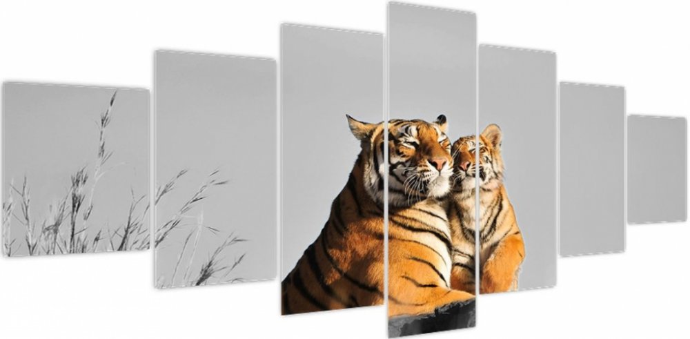 Obraz - Tygřice a její mládě, černobílá varianta, sedmidílný 210x100 cm
