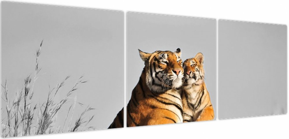 Obraz - Tygřice a její mládě, černobílá varianta, třídílný 150x50 cm
