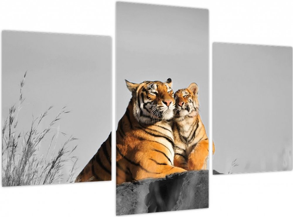Obraz - Tygřice a její mládě, černobílá varianta, třídílný 90x60 cm