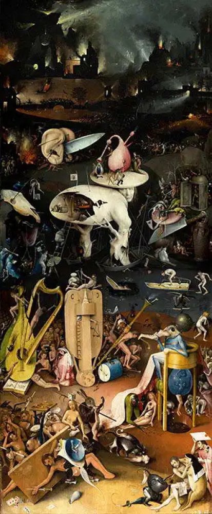 Obrazy - Bosch, Hieronymus: Zahrada pozemských rozkoší - peklo, zatracení (pravá část) - reprodukce obrazu