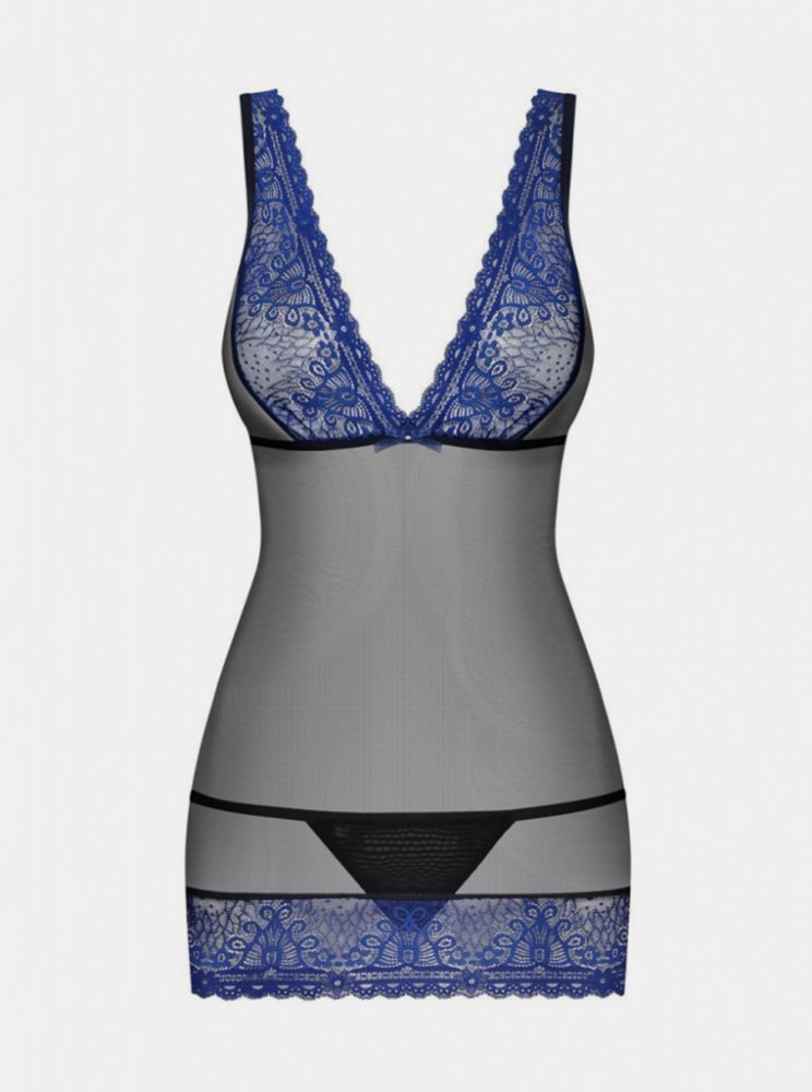 Krásné košilka v jemném střihu. Kombinace černé, průsvitné síťoviny a krásné krajky v odstínech modré. Nastavení ramínek - snadné přizpůsobení. Výstřih a ramena zdobené krajkou. Měkké trojúhelníkové košíčky s vertikálním švem krásně vystavují prsa. Jemná mašlička pod prsy s lesklým přívěskem. Vertikální švy na stranách. Sada obsahuje košilku a tanga. Jemný na dotyk, perfektně elastický materiál. S...