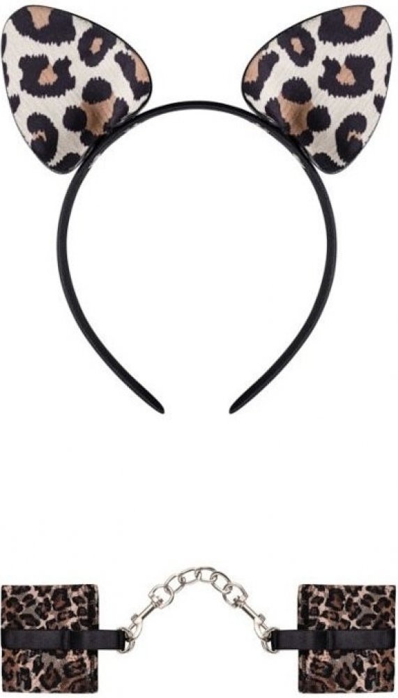 - jedinečná pouta a čelenka, které podtrhnou vaši divokou povahu.- měkká čelenka z hnědé a černé puntíkované látky- sexy kočičí uši- skvrnitý vzor na krajce pro krásný vzhled- odnímatelný zlatý řetízek