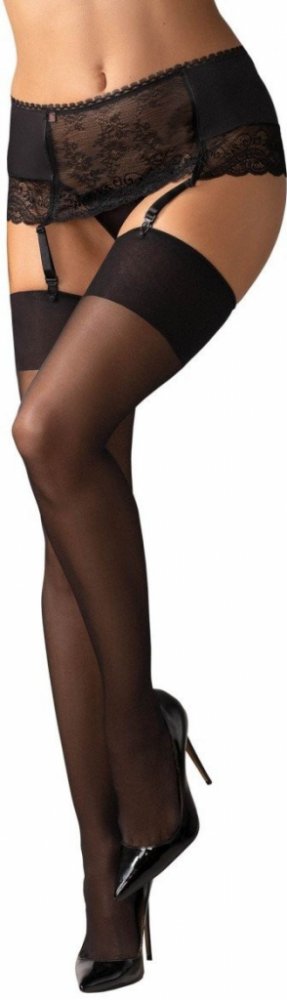 Dámské punčochy S800 černé barvy z kolekce Obsessive jsou vkusným doplňkem každého prádla. Punčochy mají na široký zesílený lem, jsou pružné a krásně přilnou na tělo. Lem punčoch není samodržící, punčochy se snadno připnou k podvazkovému pásu.
