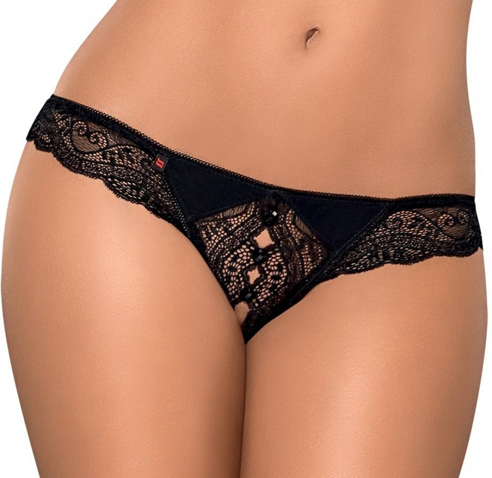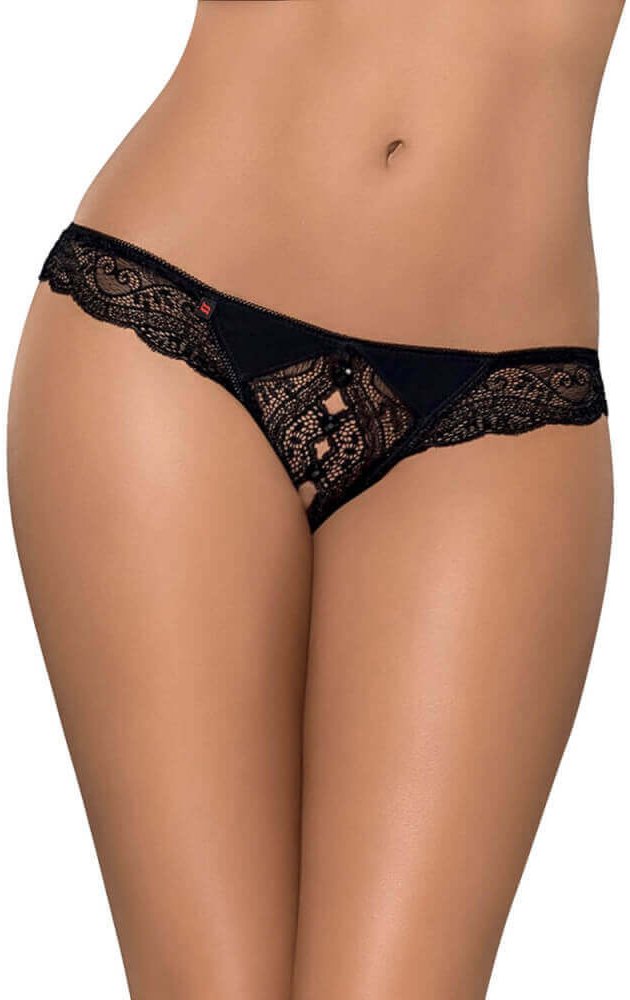 Dotek měkké krajky, která něžně obejme a budeš v ní vypadat extra sexy. Tanga z měkké, pohodlné, pružné krajky s krásnou, detailně vypracovanou vzorkem Na předním dilema vzrušující, sexy Otevřít, vzadu je látka spojena pouze několika lesklými štrasovými kamínky. Kalhotky jsou v klíně zcela otevřené, takže se dají nosit i během aktu. Materiál: polyamid 85%, elastan 15% Černá barva. Velikost: S-L (j...