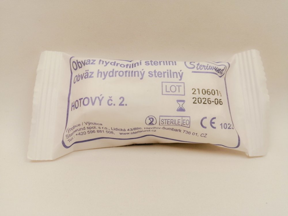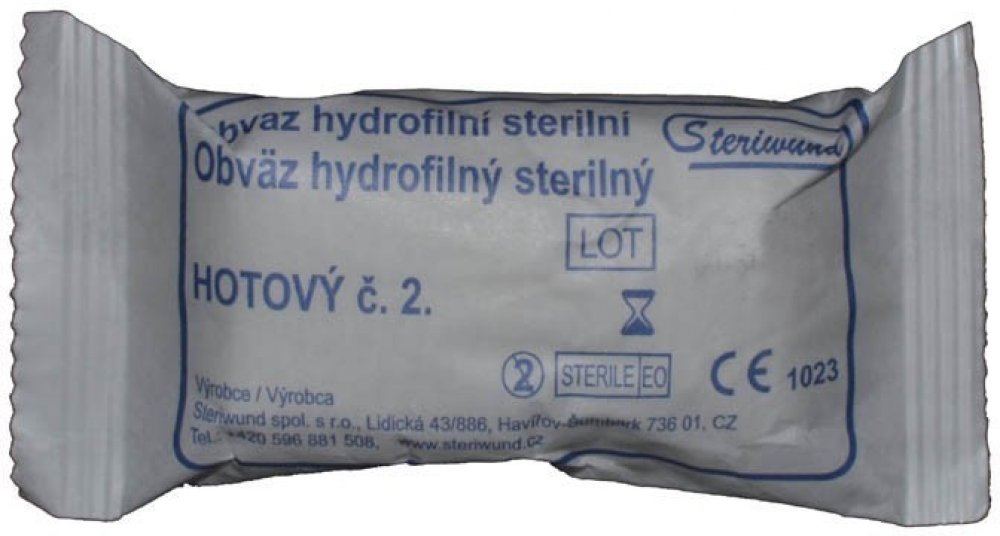 Obvaz pro předlékařskou pomoc s kompresem. Hotový a sterilní obvaz je složen z hydrofilního obinadla a jednoho pevně připevněného savého kompresního polštářku (Zetuvit E) pro ošetření otevřených ran.