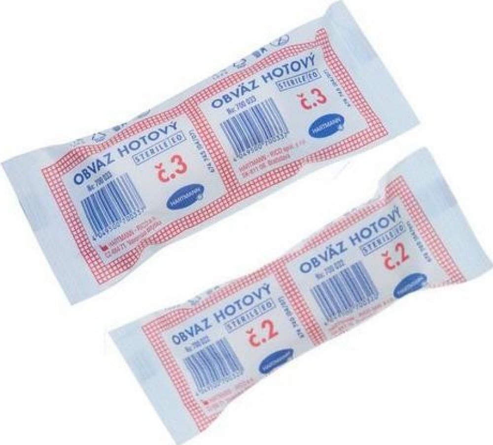 - Obvaz hotový č. 3 - obinadlo a dva savé kompresy. V kartonu 240 ks.