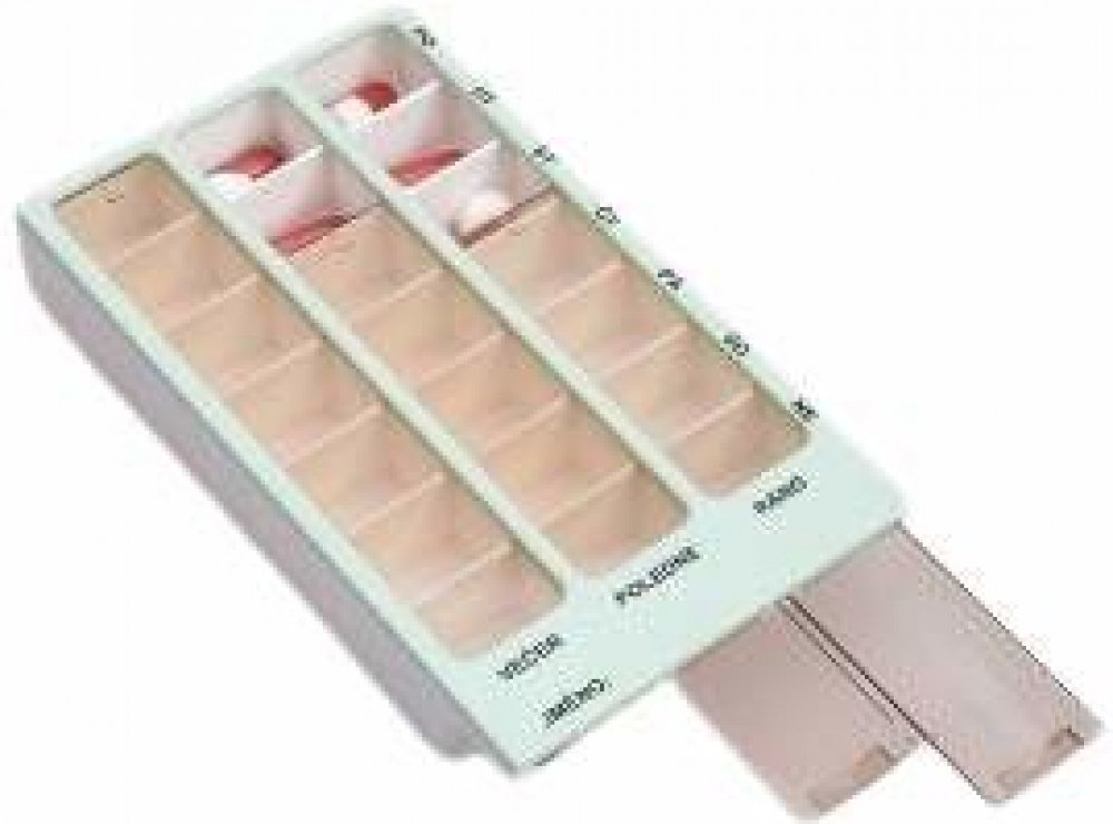 Týdenní dávkovač léků. Dávkovač léků umožňuje přehledné uložení léků nebo potravinových doplňků na týden dopředu s rozdělením na tři denní dávky. Konstrukce zajišťuje jednoduché otevření příslušné denní dávky léků se zajištěním ostatních proti vysypání. Dávkovač je možno označit jménem pacienta.