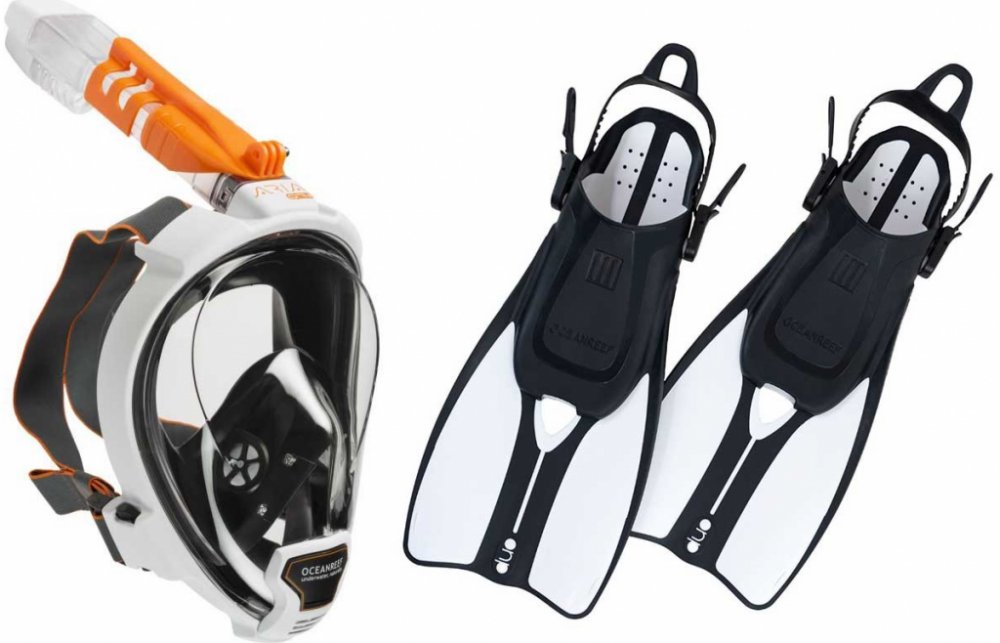 Šnorchlovací set OCEAN REEF ARIA QR + DUO TRAVELSet složený z celoobličejové šnorchlovací masky Aria QR+ s textilními popruhy na odepínání a držákem na kameru a komfortními ploutvemi DUO TRAVEL.Celoobličejová šnorchlovací maska ARIA QR+Nabízí neomezené zorné pole 180 °, suchý šnorchl, nové rychlé upínací přezky a plynulé, hladké dýchání. Při dýchání se v ní nehromadí CO2 (oxid uhličitý). Je vyrobe...