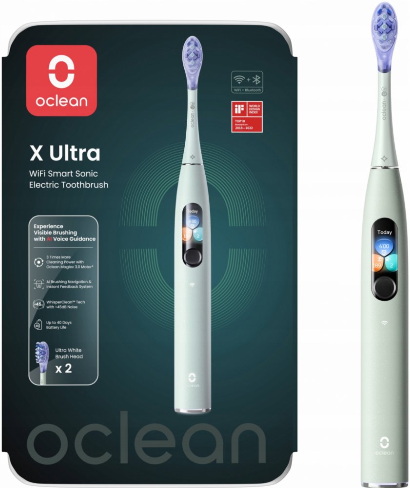Chytrý sonický kartáček Oclean X Ultra s barevným dotykovým displejem, magnetickým motorem, AI technologií a napojením na aplikaci. Kombinace těchto technologií vás naučí získat správné návyky při čištění zubů a dá vám okamžitou vazbu.Oclean 3.0 Maglev motor vykoná až 84 000 pohybů za minutu a díky TurboClean systému v kombinaci s hlavicemi je pak čištění až 3x efektivnější. **Oproti průměrné čistící síle např. Oclean Endurance.Nejvyspělejší technologie v čištění vám dá:- 8 zónovou zpětnou vazbu na čištění ústní dutiny včetně slepých míst- upozornění na příliš vyvíjený tlak na dásně- osobní nastavení programů a aplikace Oclean Care+- každodenní interakce a zpětná vazba pro vaše individuální programyPro celou značku Oclean je typický velmi tichý chod (