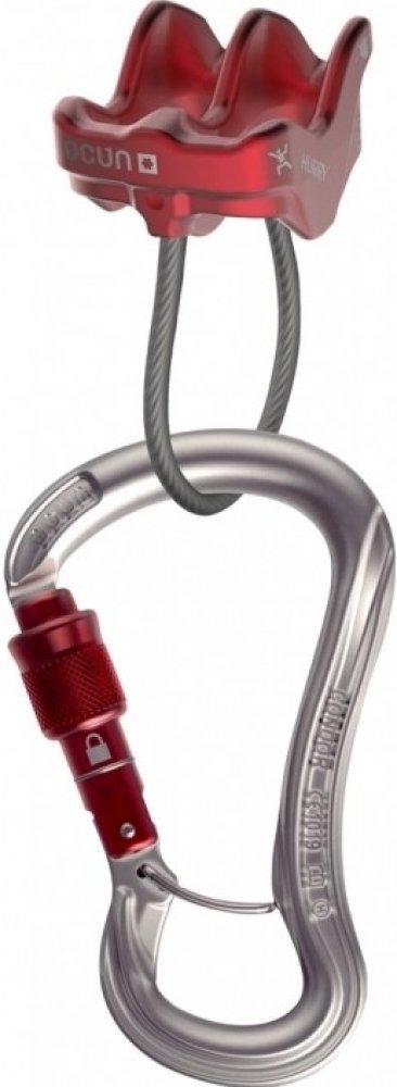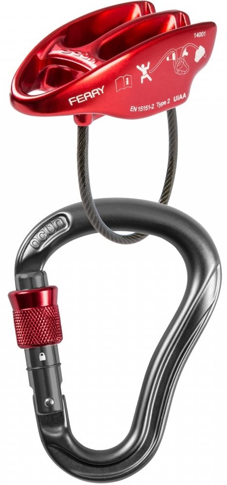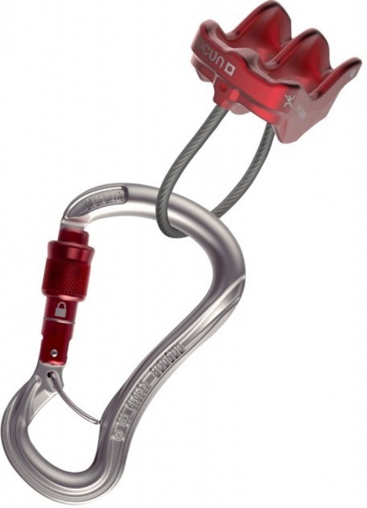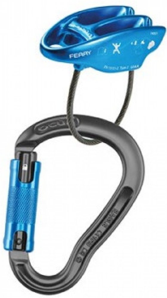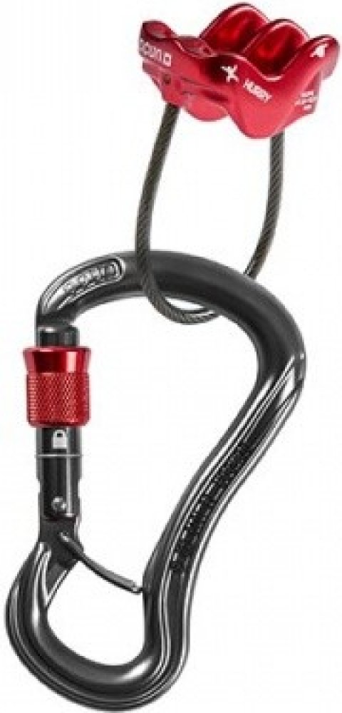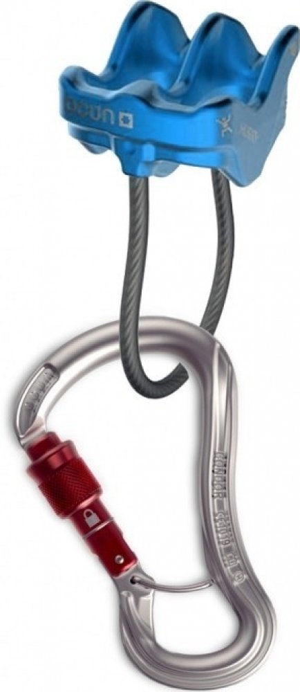 - Spojení nejbezpečnějšího modelu šroubovací karabiny s nejlehčí a nejjednodušší jistící a slaňovací pomůckou