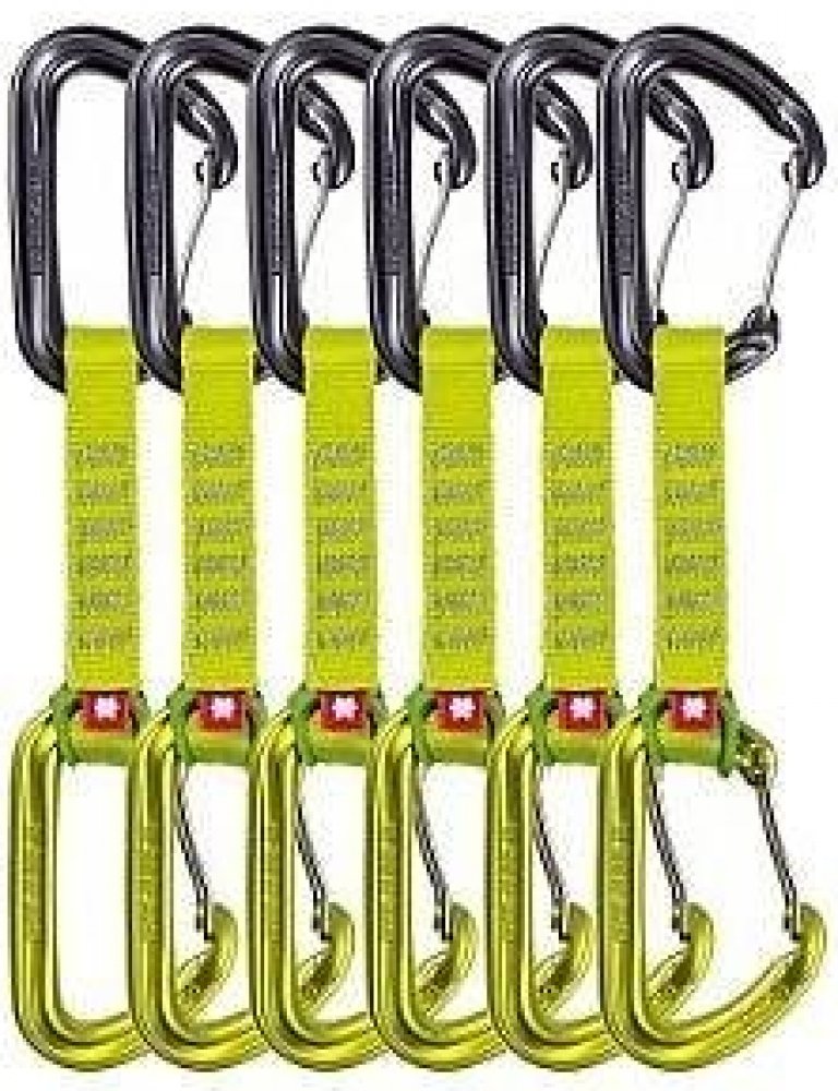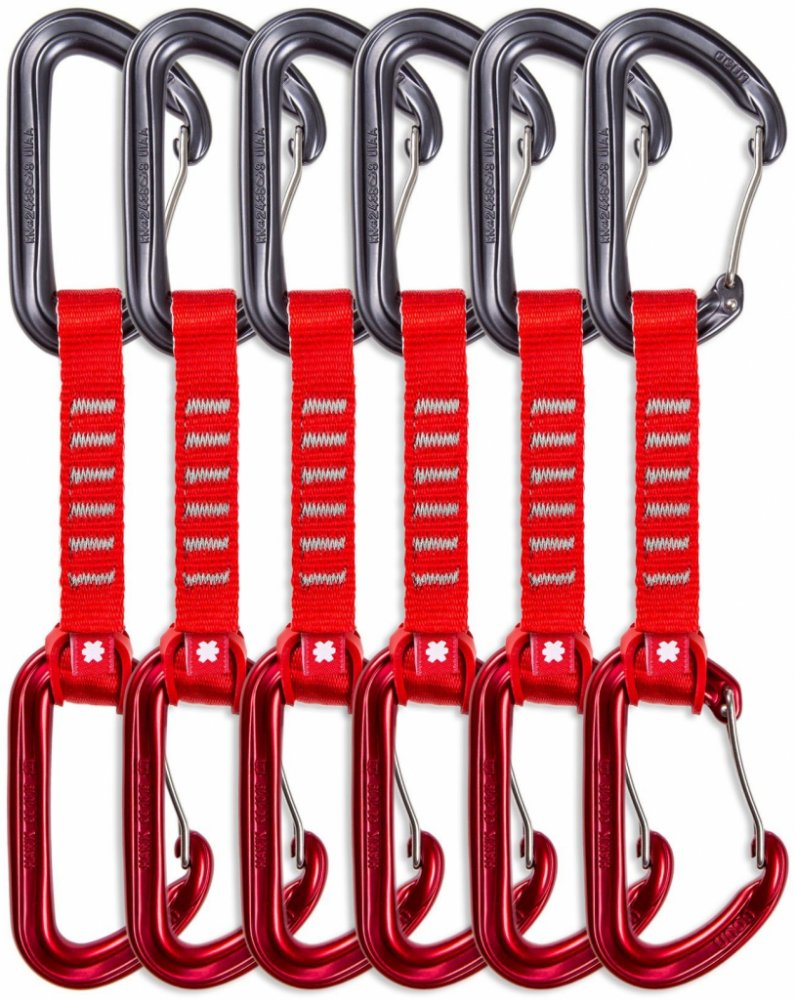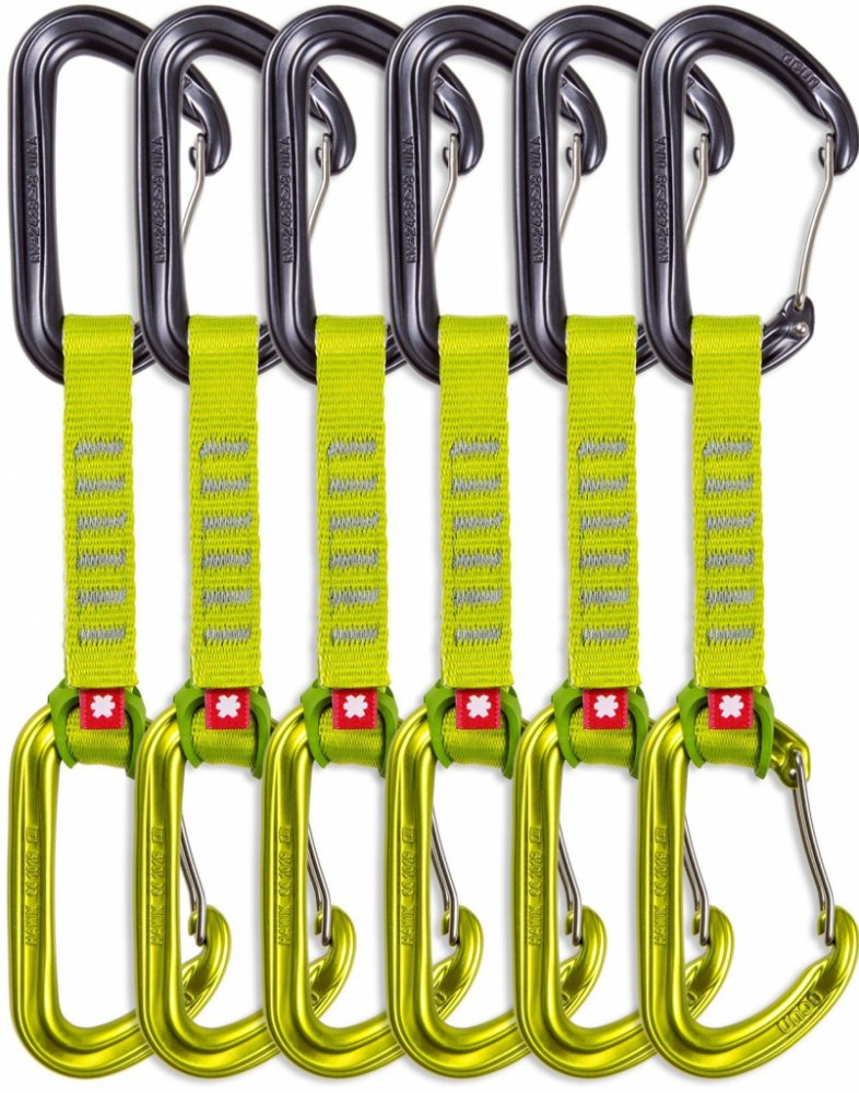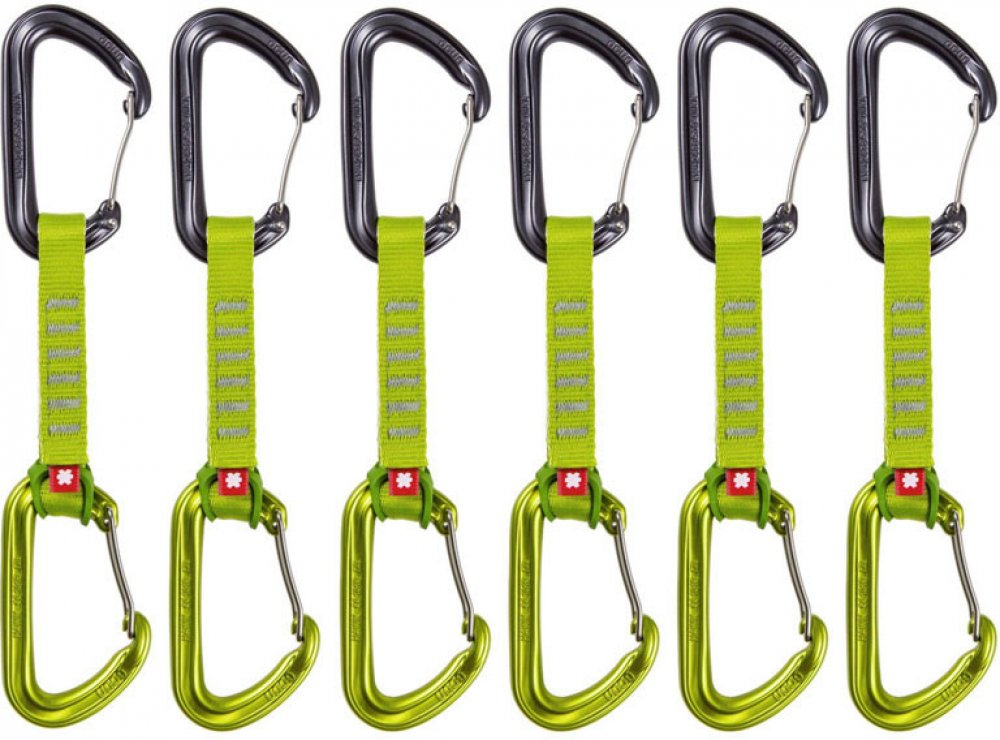 * set obsahuje 6 kusů expresek* karabiny s drátěným zámkem se snadno zacvakávají, eliminují samovolné otevření a v zimě nezamrzají* smyčka z materiálu ECO-PES obsahuje nejméně 50% recyklovaného polyesteru (recyklovaná část pochází z odpadu z jiné výroby)* spodní karabina je fixována ve správné poloze gumou Rubber Biner* eloxovaná povrchová úprava karabin