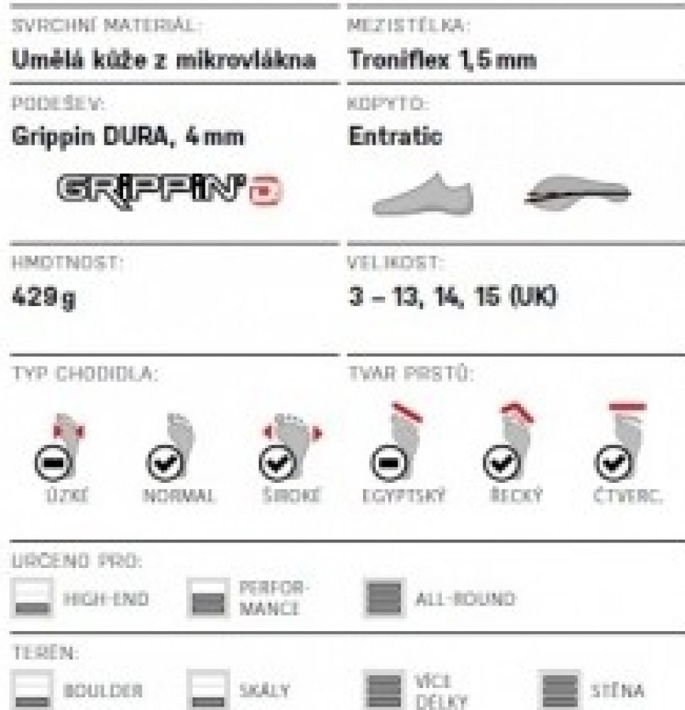 Svrchní umělá kůže z mikrovlákna zajistí tvarovou stálost a textilní podšívka a polstrovaný jazyk již zmíněné pohodlí. Podešev je vyrobena z 4 mm silné lepičky Grippin Dura , kterou jen tak neprolezete. Kopyto Entratic je jen mírně asymetrické, má anatomicky tvarovanou patu a je vhodné spíše pro normální až širší tvar chodidla.