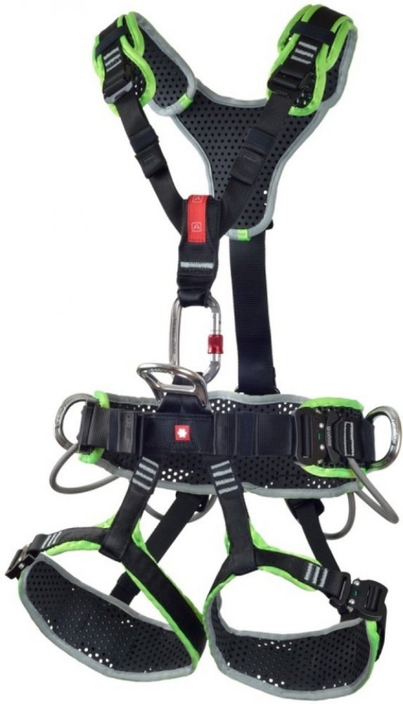 Samozřejmě nechybí přípojné body pro lavičku a karabinové sloty na nohavičkách pro umístění lan mimo pracovní prostor.