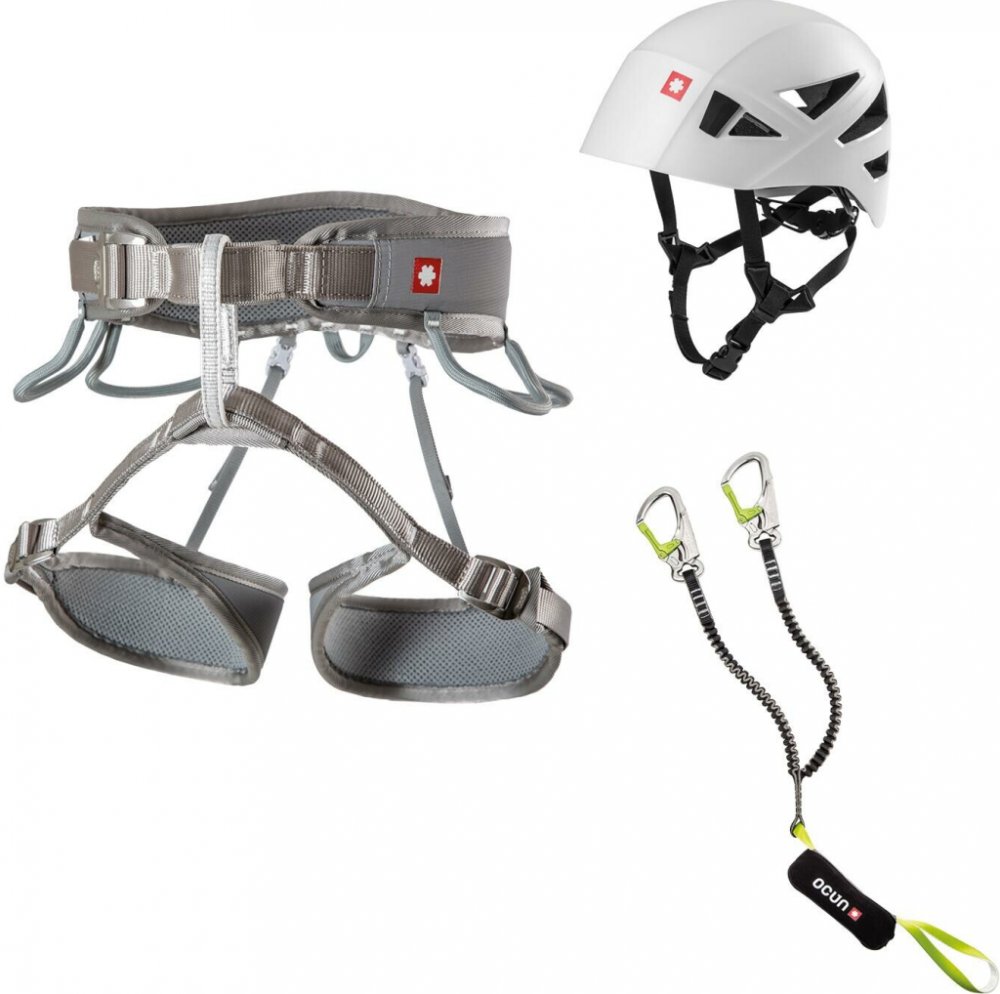 Via Ferrata Twist Pail Set obsahuje všechny bezpečnostní prvky pro pohyb na zajištěných cestách - sedák, tlumič pádu a helmu.