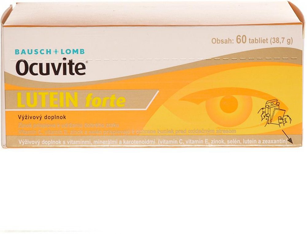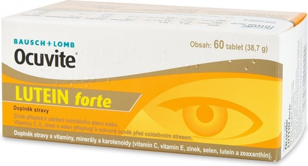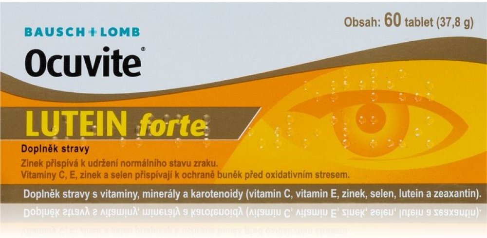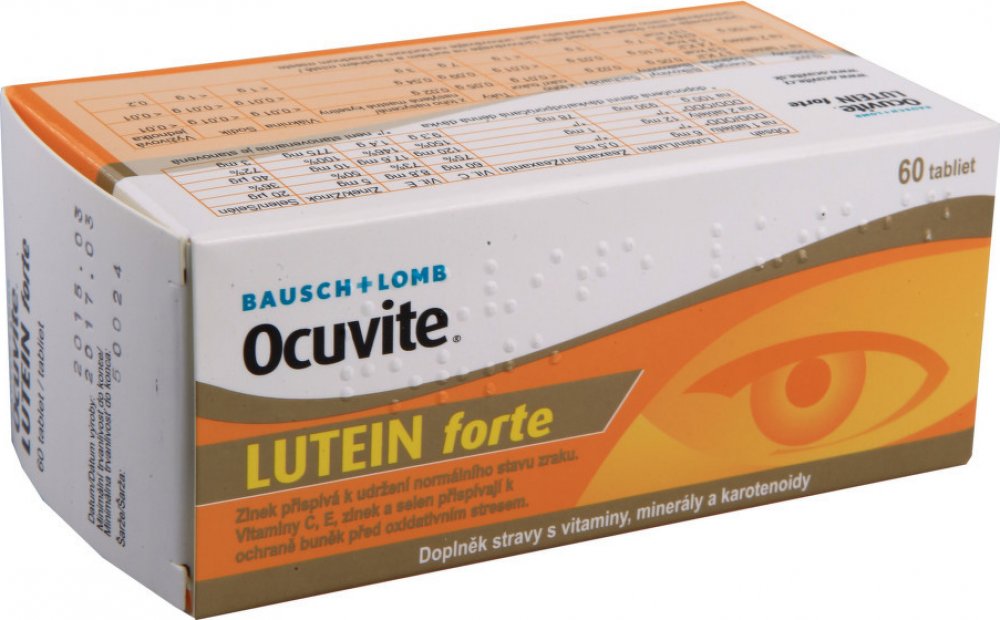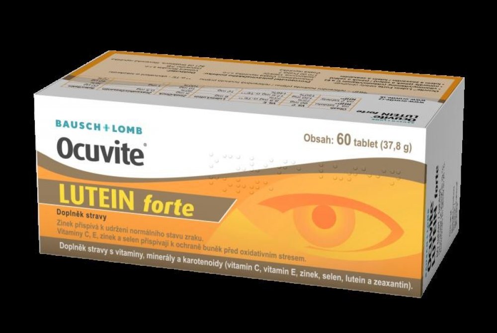 Optimální kombinace kvalitních nutričních látek ve výživovém doplňku Ocuvite Lutein forte má blahodárný účinek na oči. Konkrétní karotenoidy lutein a zeaxantin vyživují sítnici, zinek a selen přispívají k udržení dobrého zraku a vitamíny C a E působí antioxidačně (kompenzují škodlivé účinky probíhajících oxidačních procesů v oku, prevence šedého zákalu). Výjimečný lutein kromě výživné funkce působí také jako biologické „sluneční brýle“, takže chrání oči před UVA a UVB paprsky, čímž snižuje nebezpečí vzniku očních chorob. Složení výživových doplňků Ocuvite Lutein forte a jeho dávkování vychází z vědeckých poznatků.