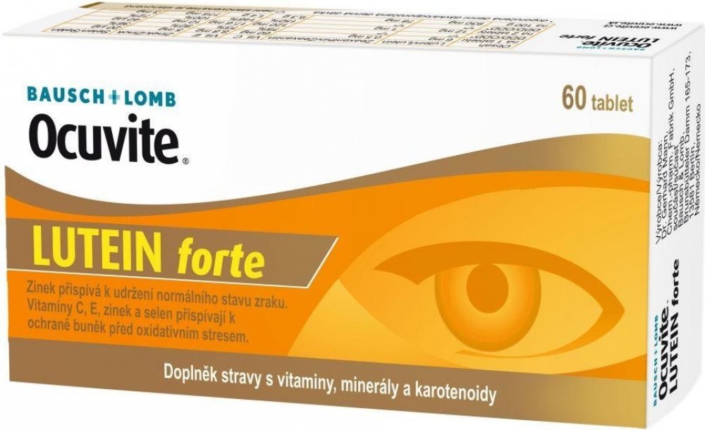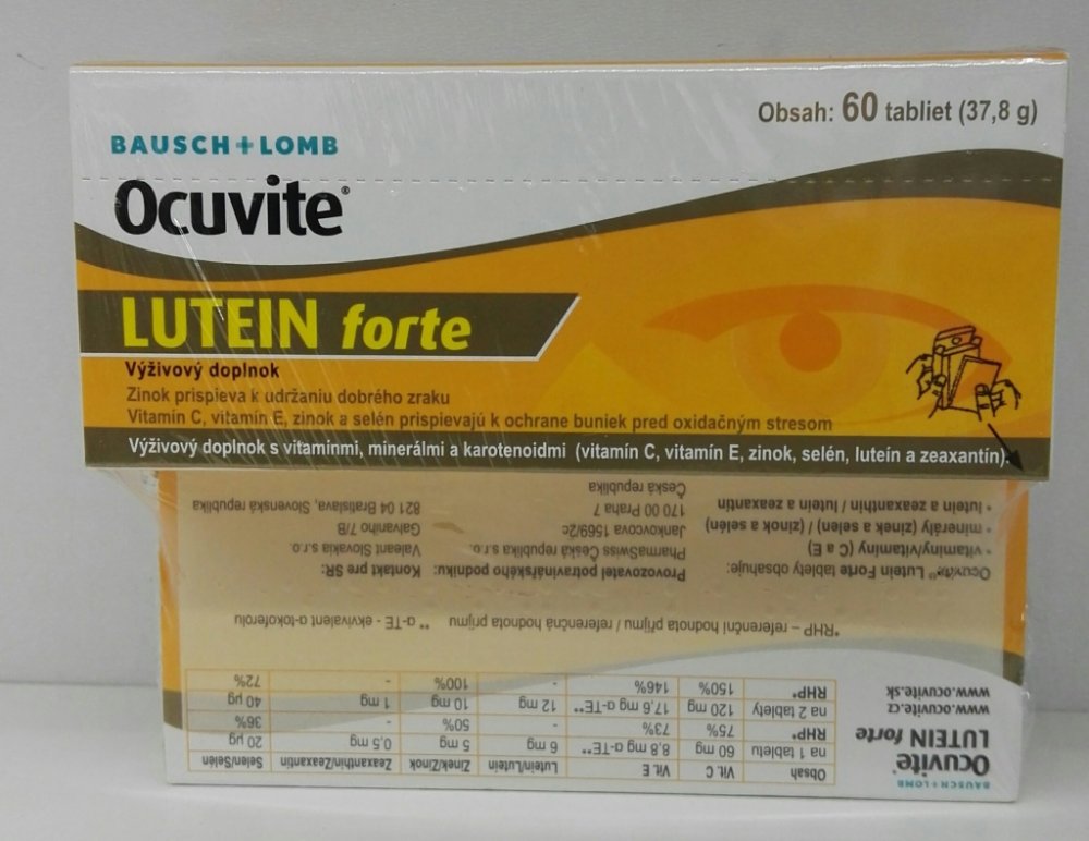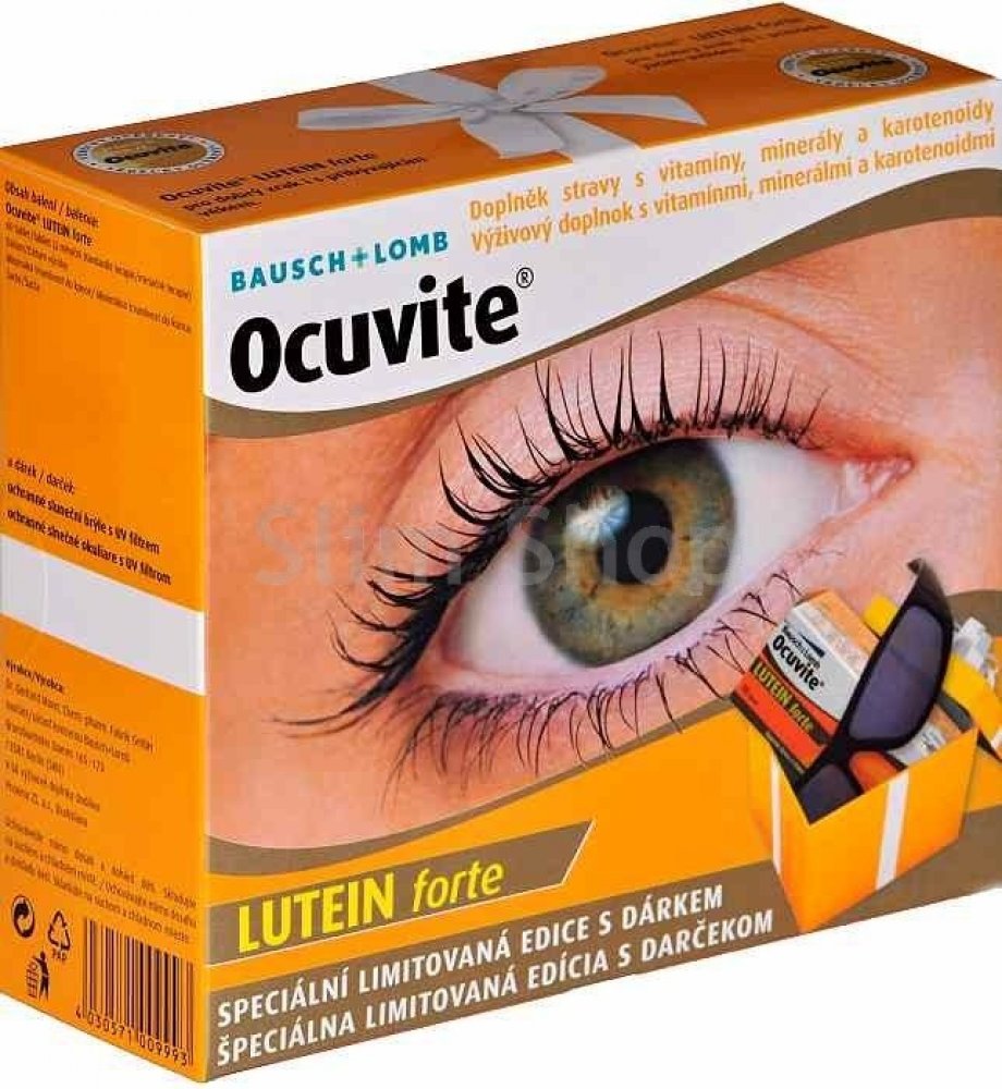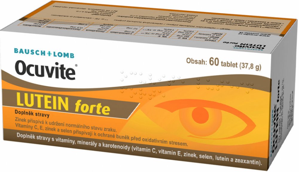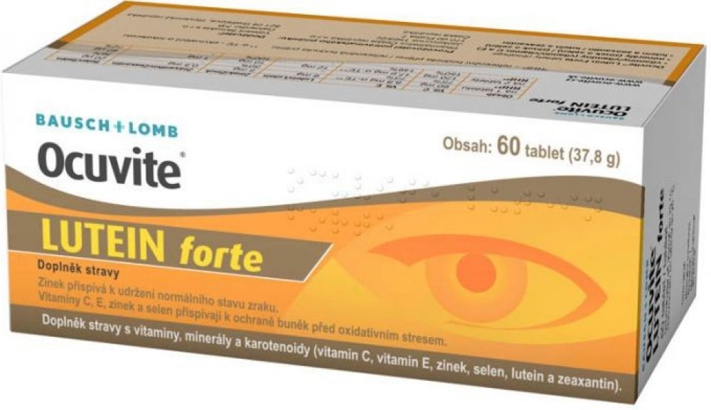 Optimální kombinace kvalitních nutričních látek ve výživovém doplňku Ocuvite Lutein forte má blahodárný účinek na oči. Konkrétní karotenoidy lutein a zeaxantin vyživují sítnici, zinek a selen přispívají k udržení dobrého zraku a vitamíny C a E působí antioxidačně (kompenzují škodlivé účinky probíhajících oxidačních procesů v oku, prevence šedého zákalu). Výjimečný lutein kromě výživné funkce působí také jako biologické „sluneční brýle“, takže chrání oči před UVA a UVB paprsky, čímž snižuje nebezpečí vzniku očních chorob. Složení výživových doplňků Ocuvite Lutein forte a jeho dávkování vychází z vědeckých poznatků.