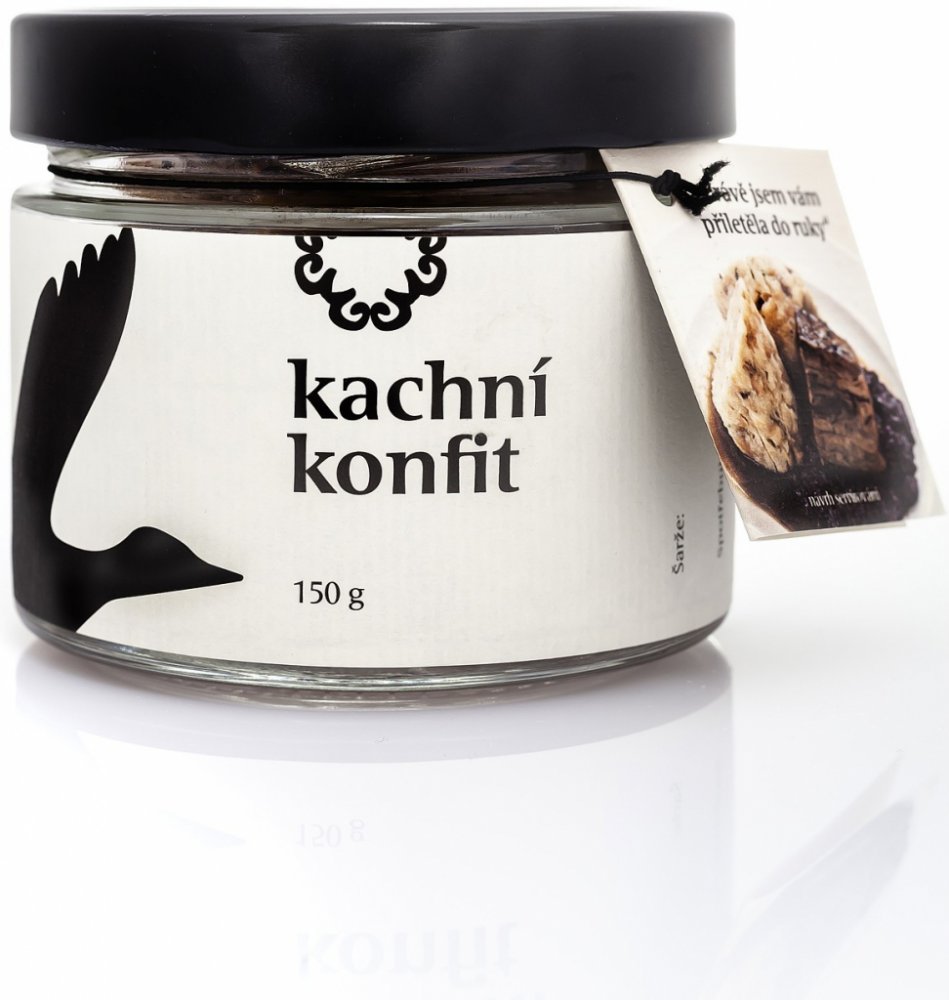 Masný výrobek – polokonzerva Složení: kachní maso 70%, vepřové sádlo, rajčata, cibule, celer, mrkev, česnek, jedlá sůl, naše směs koření, červené víno (obsahuje siřičitany). Použití: Pro opravdový gastronomický zážitek z pohodlí Vašeho domova doporučujeme do rozehřáté omáčky (cca 70°C) vmíchat oříšek másla. Následně maso ohřejeme buď v troubě, a to na 200°C po dobu 12 minut nebo v mikrovlnce na 7...