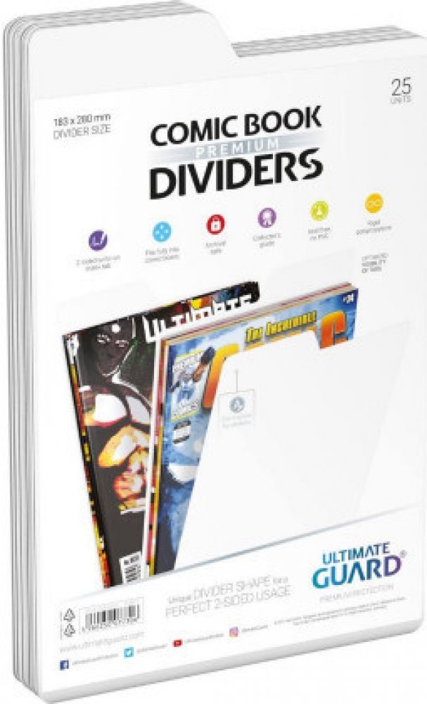 Balení obsahuje 25 ks velmi kvalitních oddělovačů na komiksy (velikosti golden, silver, regular a current size). Z obou stran oddělovače se nachází místo pro popisek a více prostoru pro samolepky. Nový optimalizovaný rozměr: 18,3 x 28 cm.