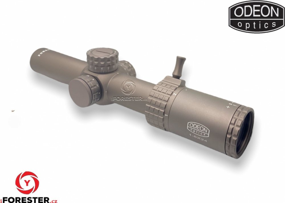 Vysoce kvalitní puškohled se zvětšením 1x – 6x a objektivem 24 mm od značky ODEON OPTICS série FORESTER. Tento puškohled zaujme nejen svým velice čistým a ostrým obrazem ale také svým propracovaným ovládáním. Tubus o průměru 30 mm. Tělo puškohledu vyrobené z hliníkové slitiny 6061 T6 a povrchovou úpravou tvrdý elox v matném bronzově hnědém provedení. Tělo plněno dusíkem. Odolnost vůči vodě a ochrana proti mlžení. Stranová a výšková korekce s uzamčením nastavených hodnot. Magnetické krytky objektivu a okuláru. Hodnota 1 kliku = ½ MOA. 6 stupňů intenzity jasu. Odnímatelná šroubovací páčka pro snadnější nastavení zvětšení.