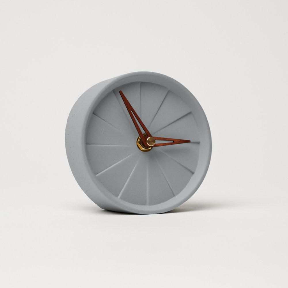 Minimalistické betonové stolní hodiny Koláč o průměru 10,5 cm – ručně vyrobené v České republice. Kompaktní hodiny z portlandského betonu vynikají jednoduchým designem a přírodním vzhledem.