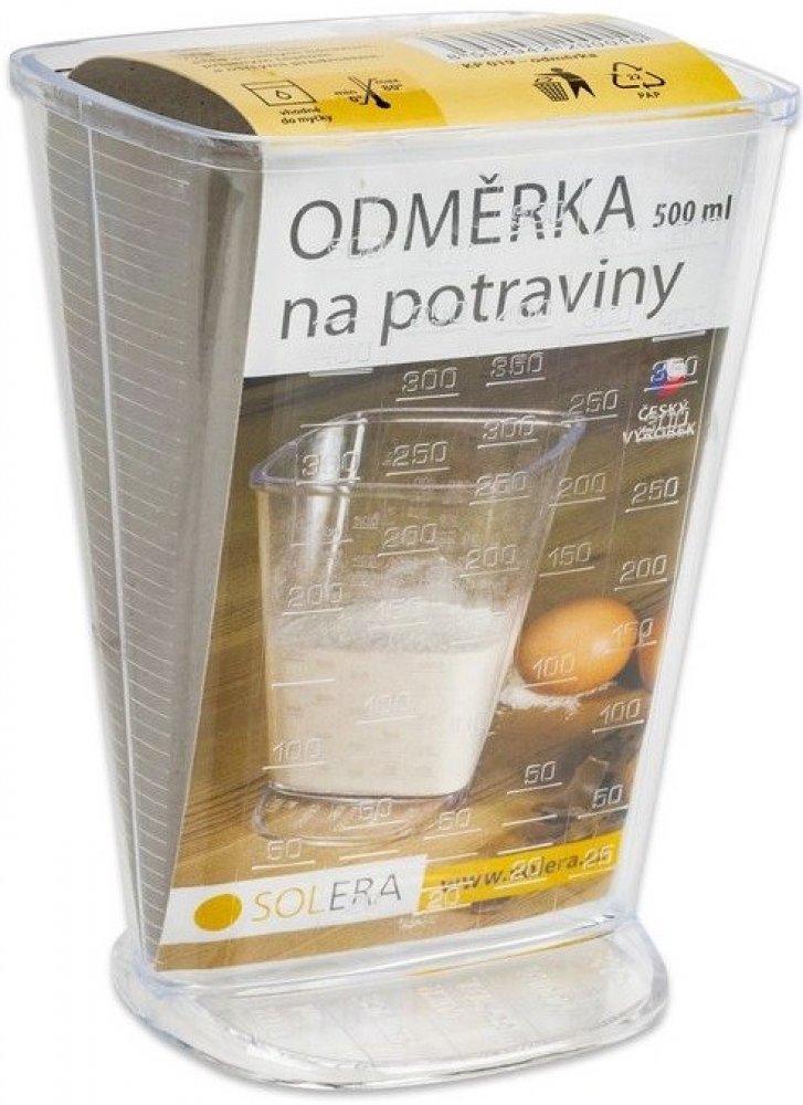 Plastová odměrka 500 ml, bez nálevky a ouška. Vhodné na sypké potraviny i tekutiny.