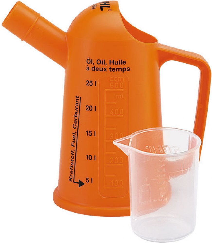 Pro přípravu směsi paliva. Dodává se ve dvou velikostech - 0,1 l pro 5 l paliva nebo 0,5 l pro 25 l paliva