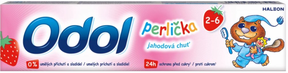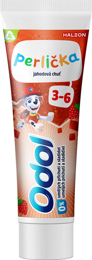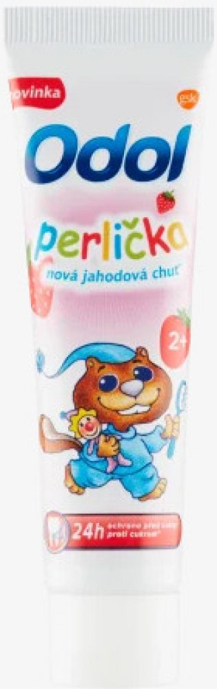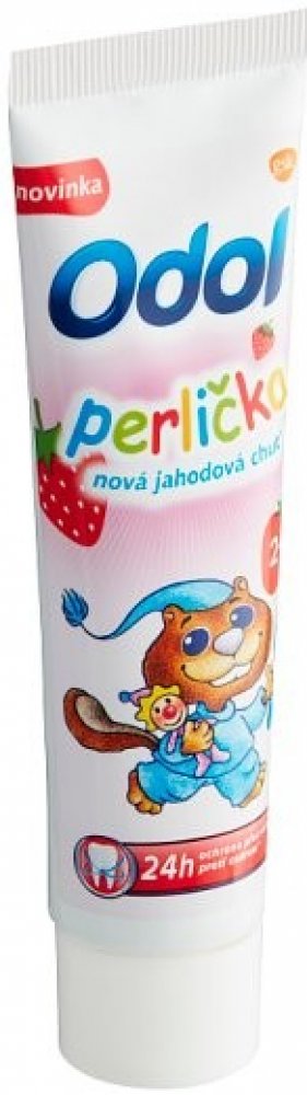 Odol dětská zubní pasta 50 ml Perlička jahodová od 2 let má velmi příjemnou jemně jahodou příchuť. Používat ji mohou děti od 2 let věku. Odol Perlička zubní pasta pro děti poskytuje mléčnému chrupu skutečně účinnou ochranu. Pomáha udržet zdravou ústní dutinu. Zanechává svěží dech.POUŽITÍ:Vždy postupujte podle návodu na obale. Zuby si čistěte dvakrát denně, ne více než třikrát. Omezte spolknutí pasty na minimum, vždy vyplivněte. Děti do 6 let včetně: Pro čištění zubů pod dohledem dospělého použijte množství o velikosti zrnka hrachu, abyste omezili spolknutí pasty na minimum.SLOŽENÍ:viz Ingredients (složení).UPOZORNĚNÍ:Omezte spolknutí pasty na minimum, vždy vyplivněte. Obsahuje fluorid sodný. Pokud je fluorid přijímán z jiných zdrojů, konzultujte svého praktického lékaře nebo zubního lékaře. Děti do 6 let: Pro čištění zubů pod dohledem dospělého použijte množství pasty o velikosti hrášku. Omezte spolknutí pasty na minimum. Pokud je fluorid přijímán z jiného zdroje, konzultujte s lékařem. Uchovávejte mimo dosah dětí. V případě podráždění přestaňte používat. Pokud příznaky přetrvávají nebo se i zhoršují vyhledejte zubního lekáře.ŽIVOTNÍ PROSTŘEDÍ:Zcela prázdný obal je možné recyklovat.