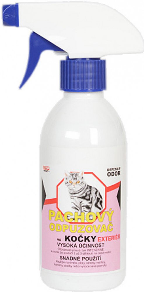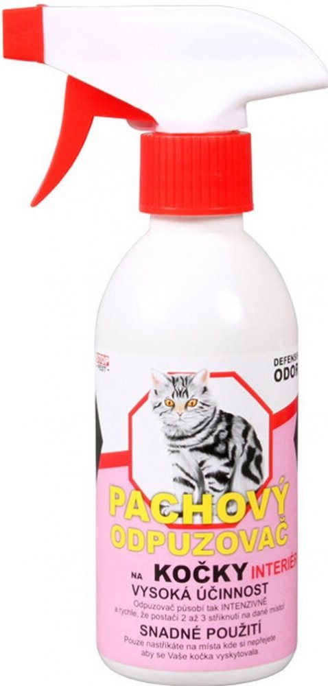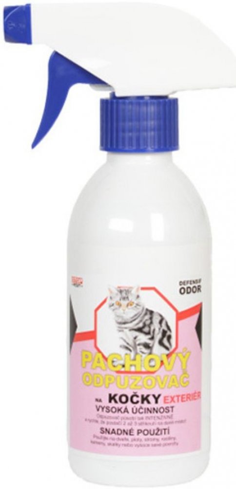 Defenzif Odor pachová ochrana na kočky je pachový odpuzovač na kočky pro použití v interiéru. Prostředek obsahuje složku, která je kočkám nepříjemná a raději se chráněným prostorům vyhnou. Obsahuje pouze přírodní látky. Prostředek je vysoce účinný - působí tak intenzivně a rychle, že postačí 2 až 3 stříknutí na dané místo. Odpuzovač lze nastříkat kolem oken, rohů bytu, noh stolu či židlí, sloupků ...