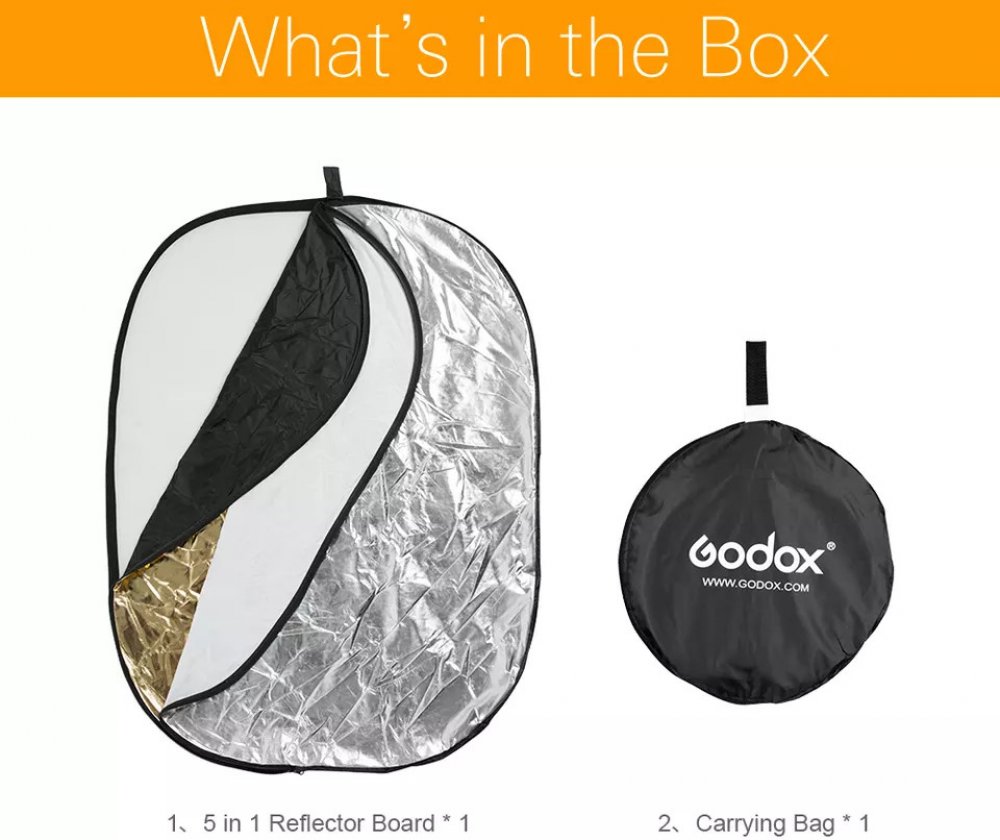 Oválná odrazná deska 5v1 s rozměrem 150x200cm rozměr sbalené desky 66cm. Obsahuje stříbrnou, zlatou a bílou odraznou plochu. Deska je dodávána složená v černém přepravním pouzdře. Zároveň může fungovat jako difuzer pro blesk.