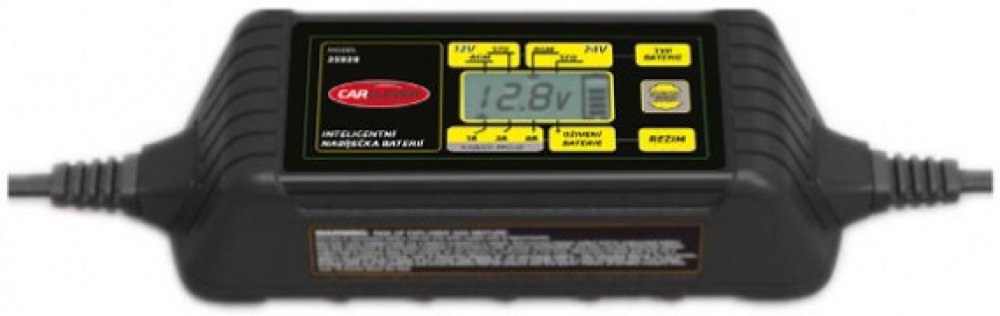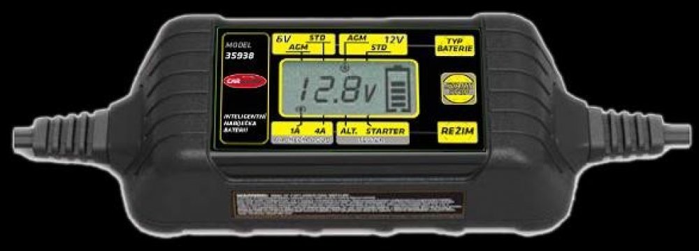 Inteligentní miniaturní nabíječka s informačním LCD, řízená mikroprocesorem pro olověné akumulátory a funkcí pro ruční rekondici (oživení) sulfatované baterie.
