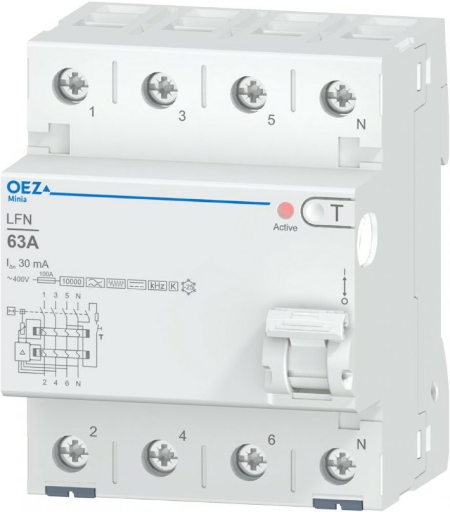 In 63 A, Ue AC 230/400 V, Idn 30 mA, 4pól, Inc 10 kA, typ B+, provedení K