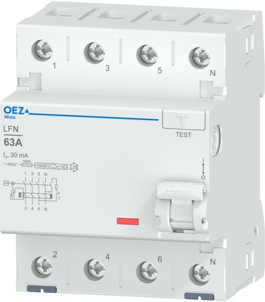 In 63 A, Ue AC 230/400 V, Idn 30 mA, 4pól, Inc 10 kA, typ A, provedení G