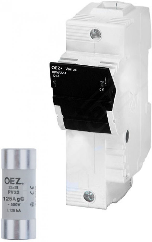 Pojistkové odpínače OPVP22 do 125 A. Pojistkové odpínače OPVP22 jsou určeny pro válcové pojistkové vložky pro jištění polovodičů velikosti 22x58 mm typu PV522 a pro výkonovou pojistkovou vložku PV22 125 A gG, aM 22x58. Pojistkové odpínače OPVP22 lze v uzavřeném stavu zaplombovat. Přístroje jsou řešeny jako modulární a pro výřez v rozváděči 45 mm. Montáž na U lištu typu TH35 dle ČSN EN 60715 nebo na desku (doporučena ocelová lišta). Stav pojistkových vložek lze signalizovat pomocí elektronické signalizace, která se dodává zvlášť.Typ pojitky: 22x58 mmPočet pólů: 1