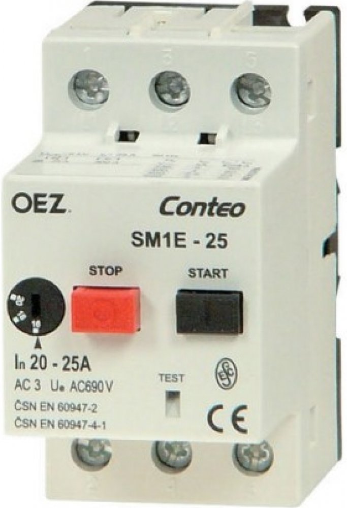 Základní funkce: Spínání a jištění motorů do 25 A. Ochrana proti zkratu a ochrana proti přetížení. Přístroj reaguje na výpadek fáze. Přístroj je vybaven kompenzací vlivu okolní teploty. Přístroje SM1E nahrazují přístroje SM1. Příslušenství k SM1 a k SM1E nelze kombinovat. Ovládání přístroje: Spouštěče motor ovládány tlačítkovým mechanizmem. Zapínací tlačítko lze uzamknout pomocí visacího zámku. Te...