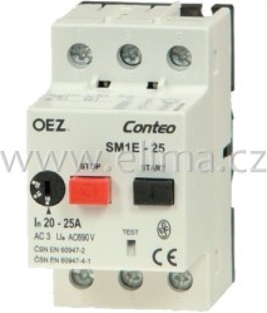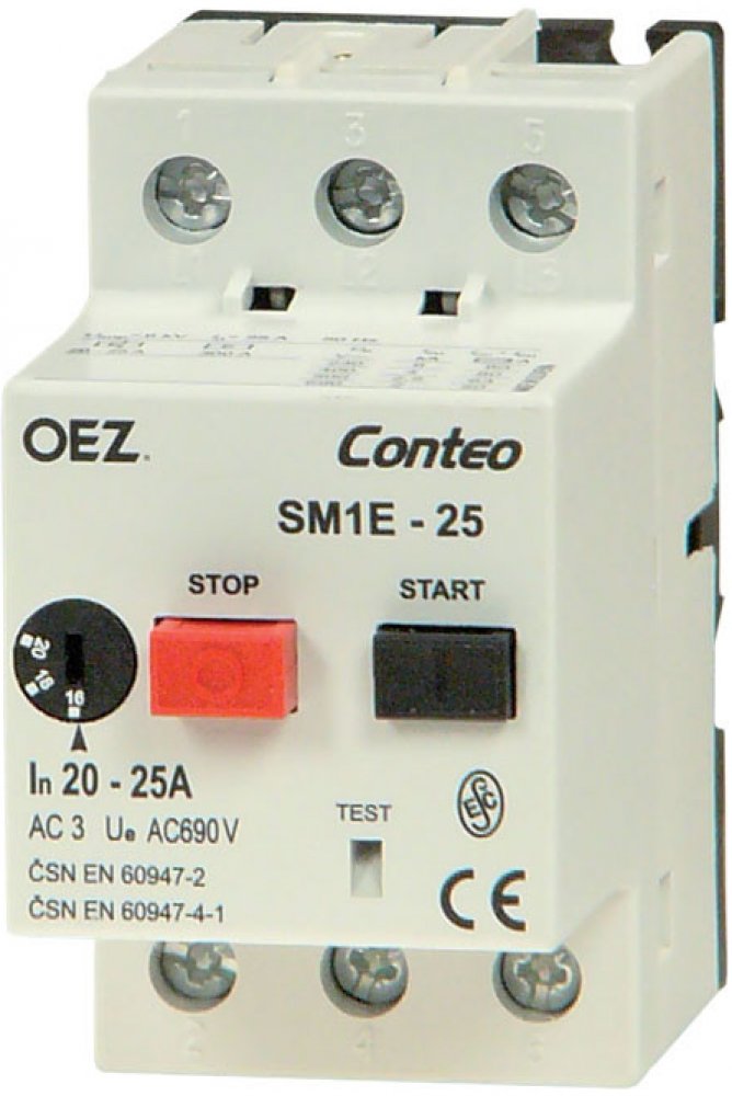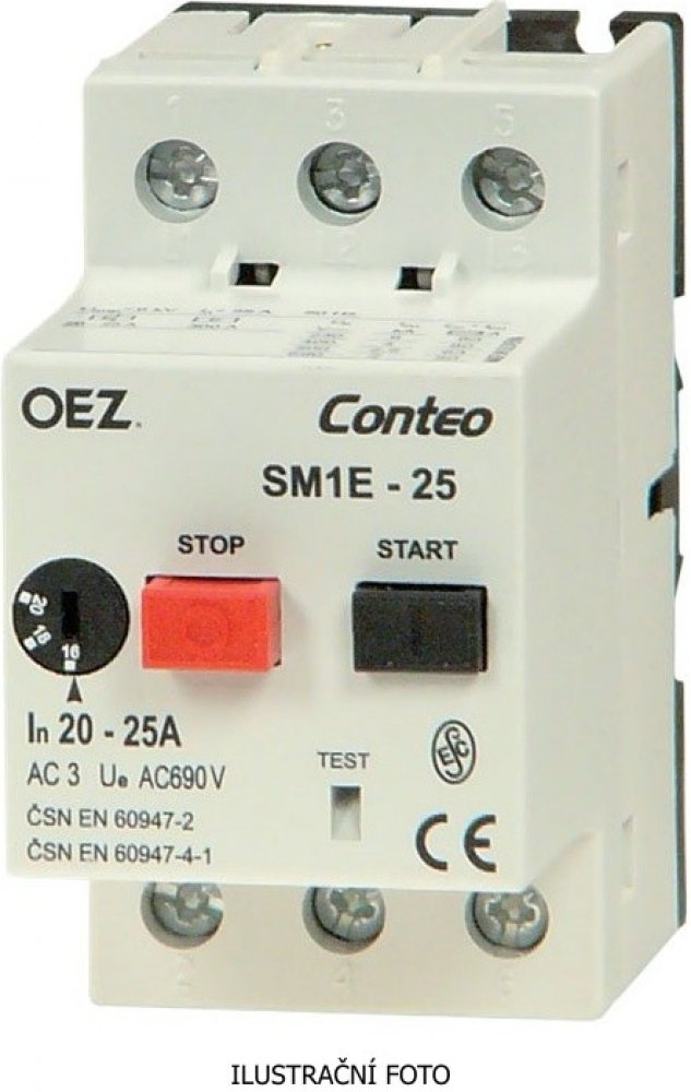 - Spínání a jištění motorů do 25 A. Ochrana proti zkratu a ochrana proti přetížení. Přístroj při výpadku fáze vypne.- Přístroj je vybaven kompenzací vlivu okolní teploty.- Spouštěče motoru se ovládají dvěma tlačítky, zapínacím a vypínacím. Nutno ovládat rázně, aby nedošlo ke svaření kontaktů.- Zapínací tlačítko lze uzamknout pomocí visacího zámku s průměrem dříku max. 4 mm2.- Tepelnou spoušť lze nastavit pomocí regulačního kotouče umístěného na čelní straně přístroje.- Okamžitá nadproudová spoušť je pevně nastavena na 14x I± 20 %.