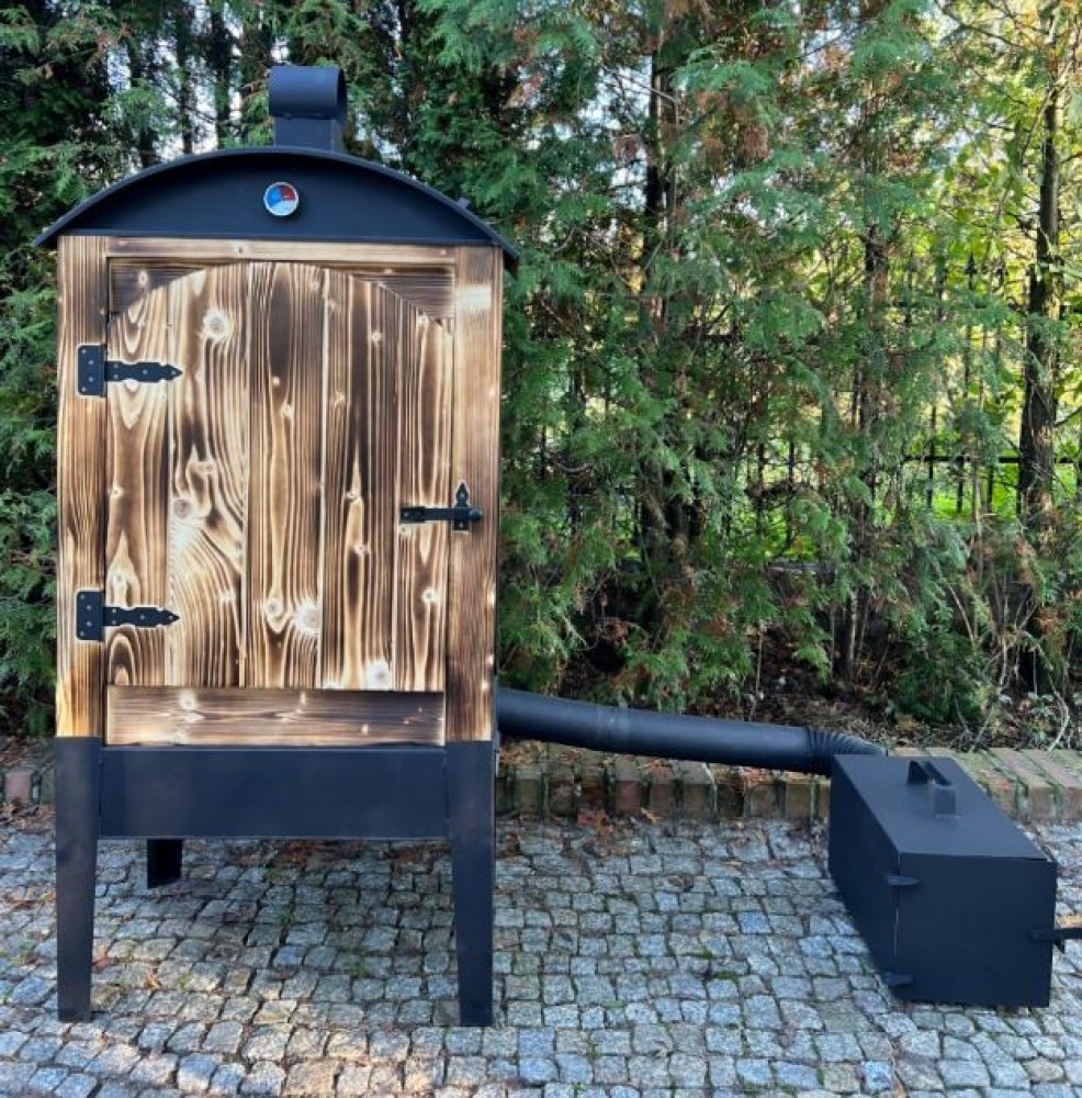 Naše premiová dřevěná udírna Hirst 80 s kováním a festovníma nohama - kompletní udírna včetně topeniště a veškerého příslušenství.