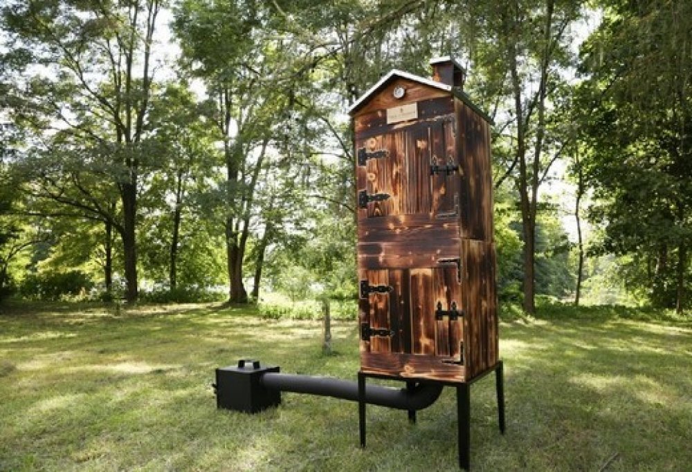 Naše dřevěná udírna s kováním a oplechovanou stříškou - XXXL opálená impregnovaná - kompletní udírna včetně topeniště a veškerého příslušenství.
