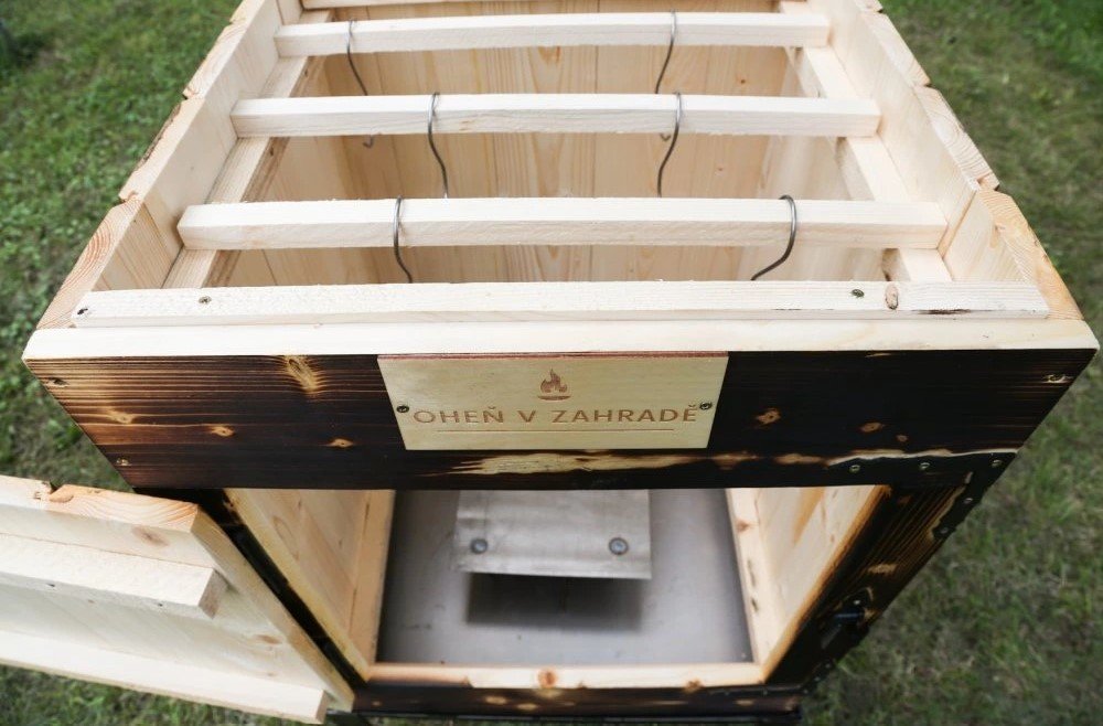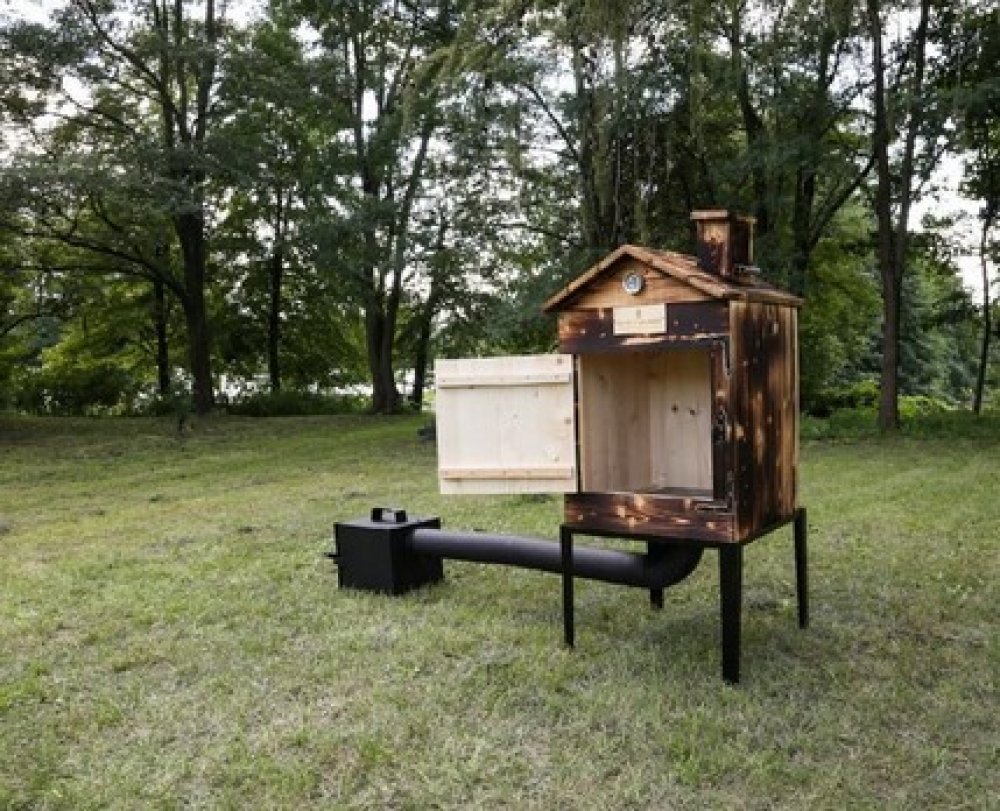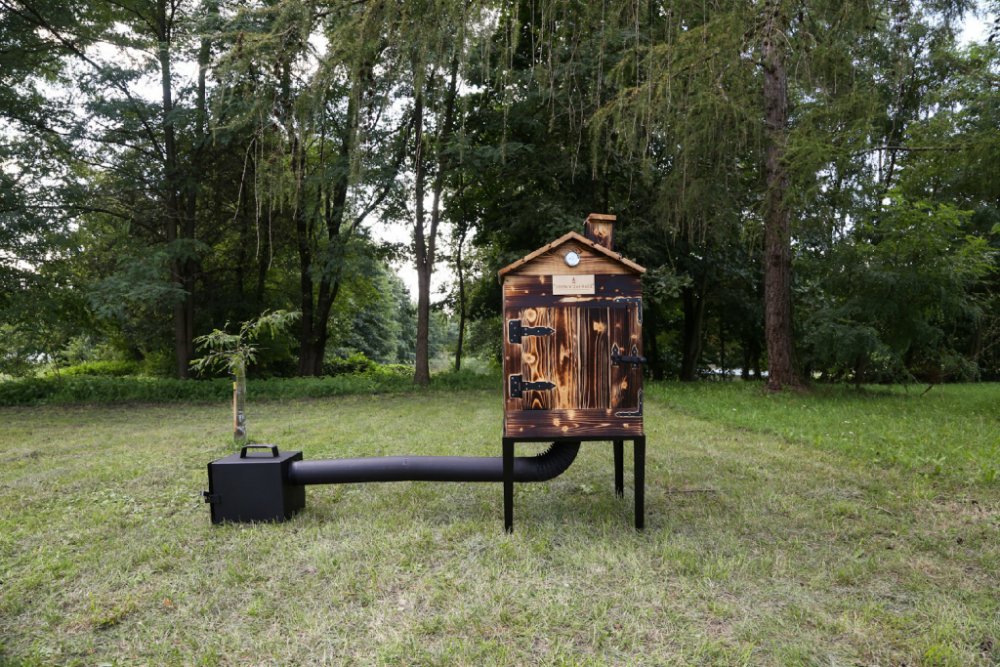 Naše Dřevěná udírna s kováním - střední opálená impregnovaná - kompletní udírna včetně topeniště a veškerého příslušenství. Ideální pro každou zahradu.