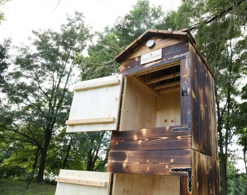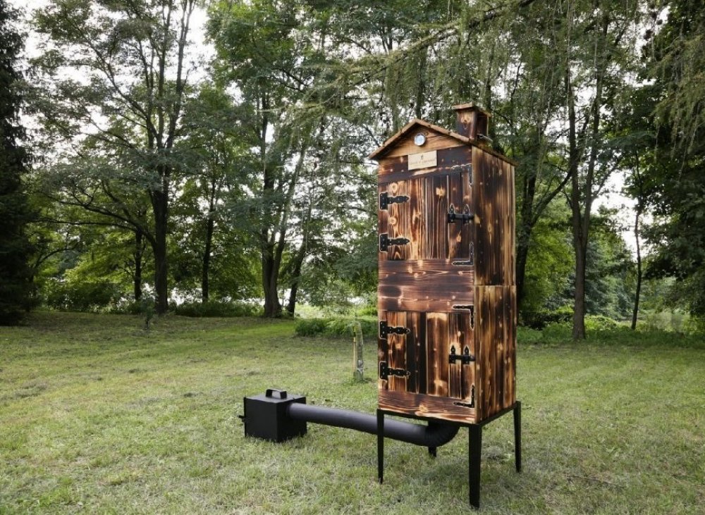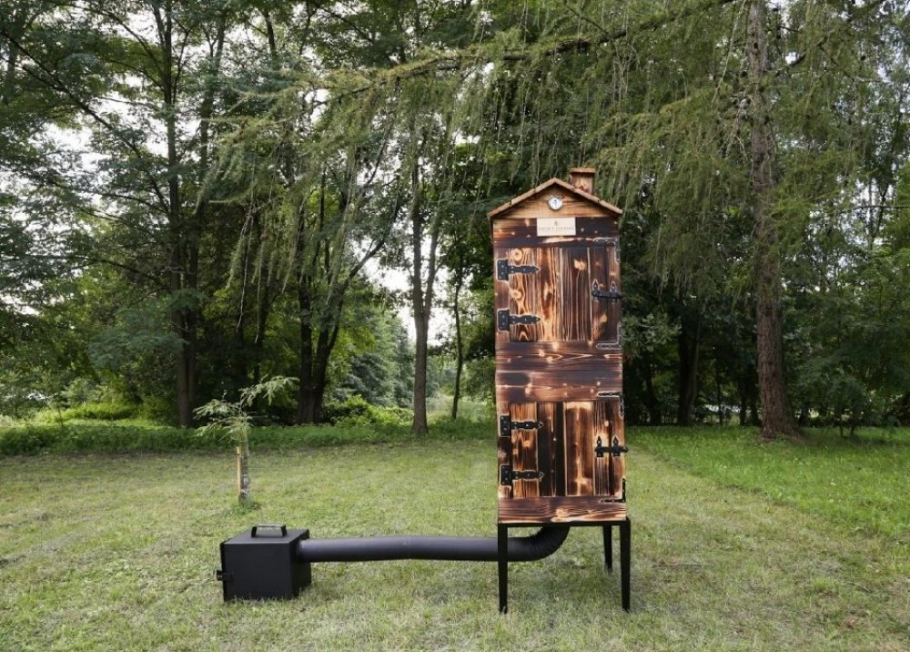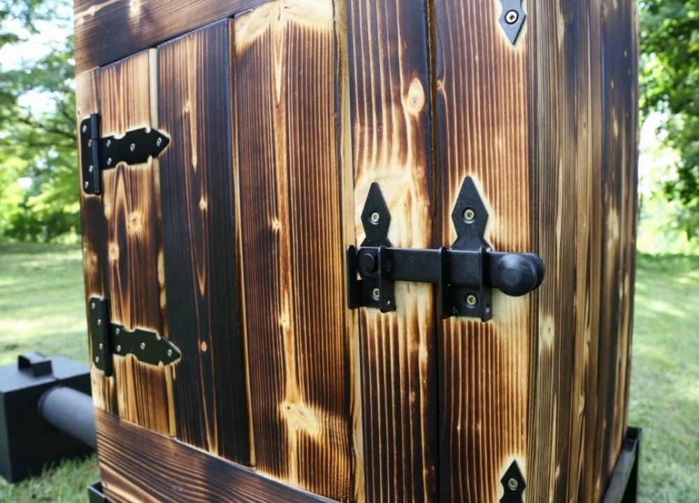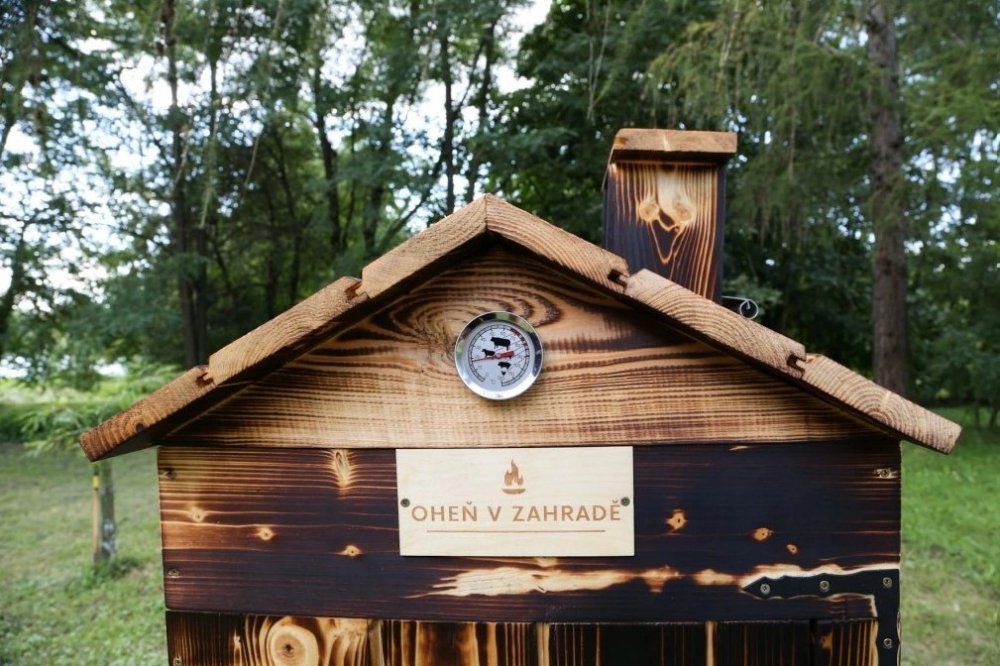 Naše dřevěná udírna s kováním - XXXL opálená impregnovaná - kompletní dvojitá udírna včetně topeniště a veškerého příslušenství.