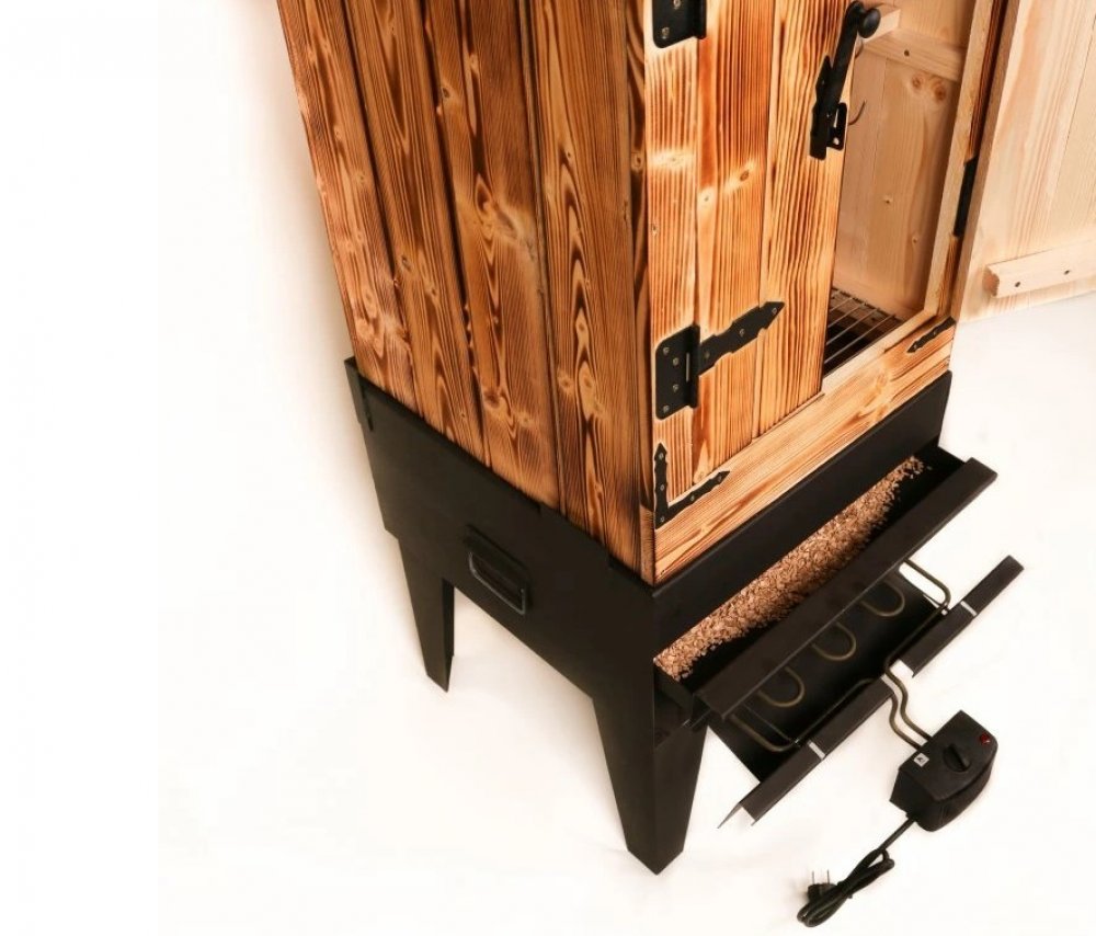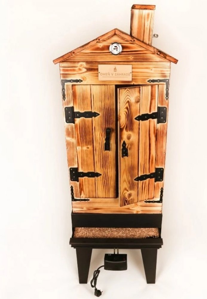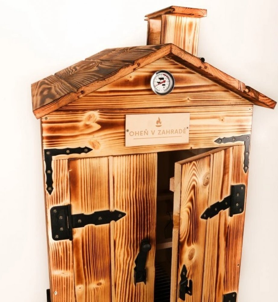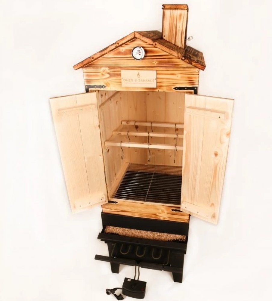 Naše Elektrická dřevěná udírna Tulkas s kováním - kompletní udírna včetně topné spirály a veškerého příslušenství.