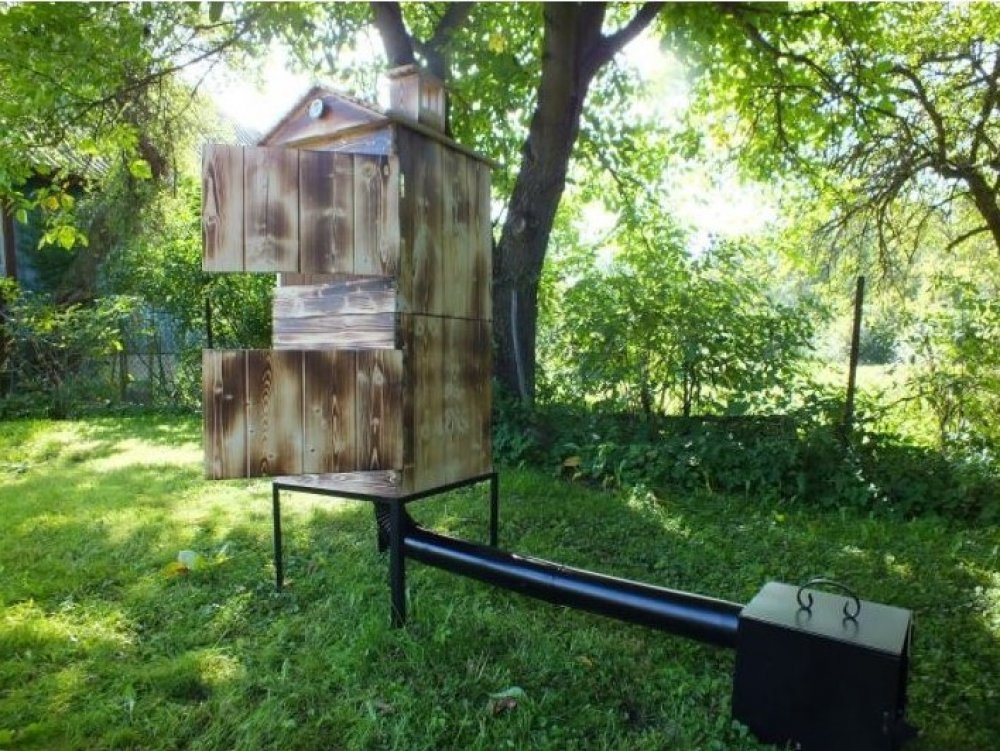 Naše zahradní dřevěná udírna XXL - opálená - ohenvzahrade - kompletní dvojitá udírna včetně topeniště a veškerého příslušenství.