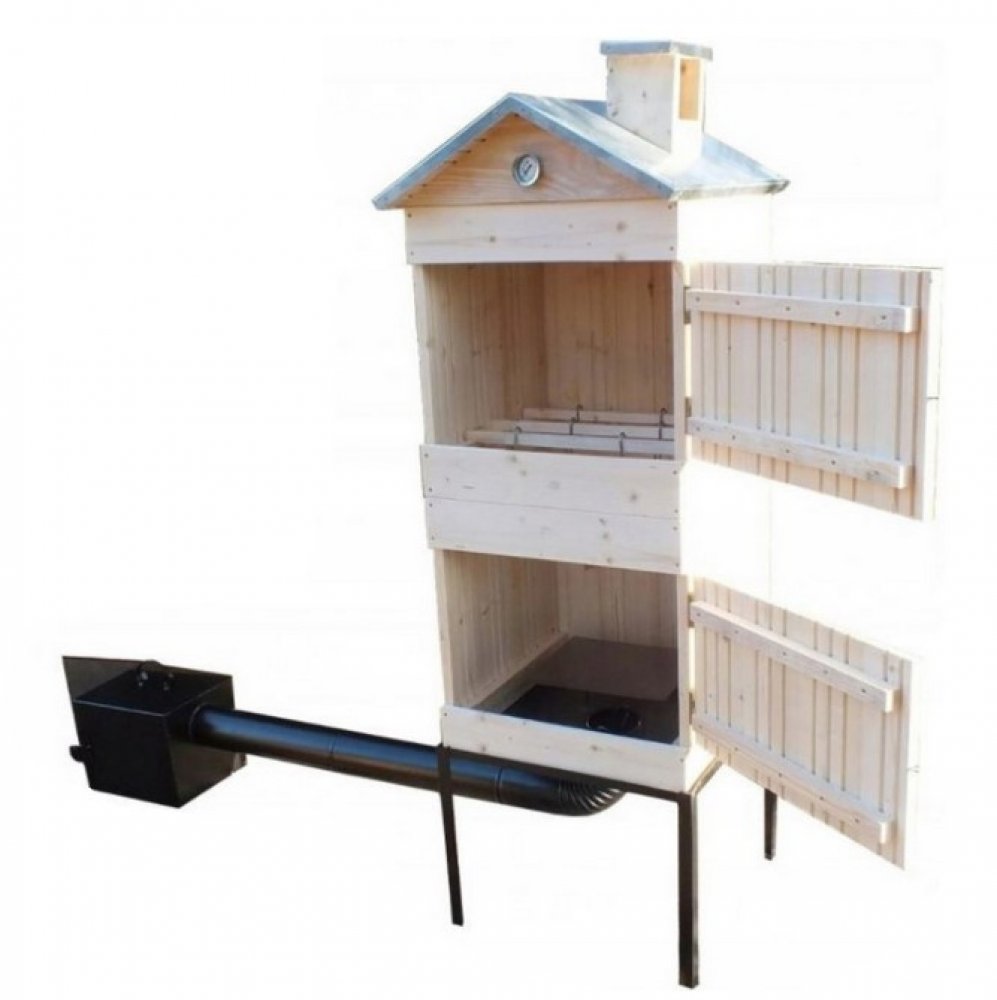 Naše velká dřevěná udírna s kováním a oplechovanou stříškou - impregnovaná - kompletní udírna včetně topeniště a veškerého příslušenství.