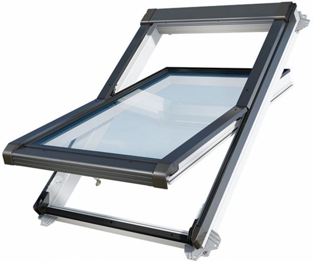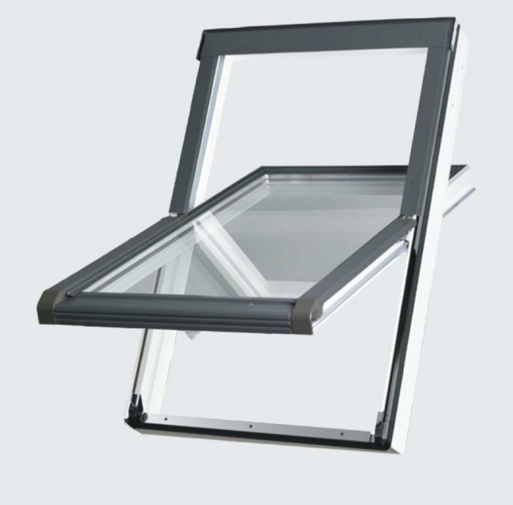 Kyvná plastová střešní okna z PVC jsou určena pro budovy s vysokými nároky na úsporu tepelné energie. Model VGOV E2 je vybaven dvojsklem o tlouštce 24 mm s Ug=1,0 W/m2K. Panty jsou umístěny uprostřed rámu okna, křídlo je možné přetočit o 180° do mysí polohy. energeticky úsporné okno z PVC vícekomorového profilu
