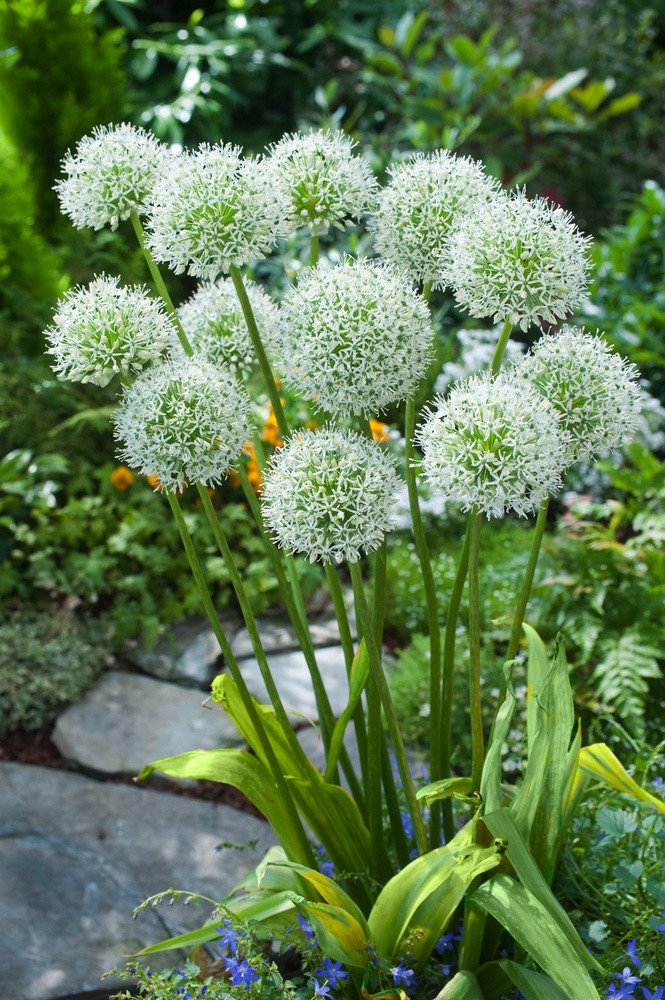Okrasný česnek 'White Giant' opravdu dostává svého jména. Tento vysoký česnek se může pochlubit velkými, hustými květenstvími, která dorůstají až do velikosti 20 cm. Velkolepé jsou i svěže zelené vzpřímené listy. Je velmi oblíbený pro včely, motýly a další užitečné opylovače. Jeho výhodou jsou pevné stonky.