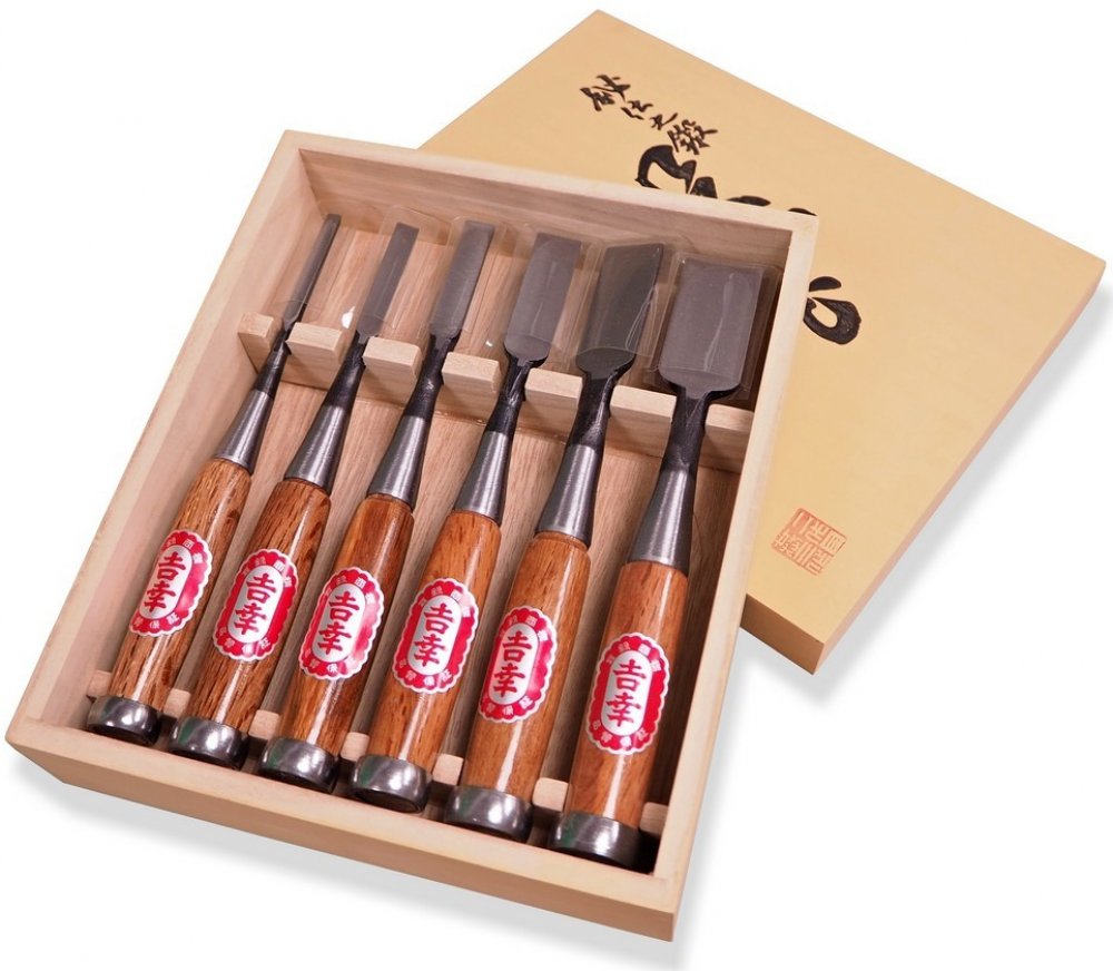 Tradiční japonská dláta ve výborné kvalitě. Ručně kovaná bílá papírová ocel. Ručka z červeného dubu. Velikosti: - 9mm - 12mm - 15mm - 18mm - 24mm - 30mm - celkový počet dlát v balení 6ks - bílá papírová ocel, 60HRC