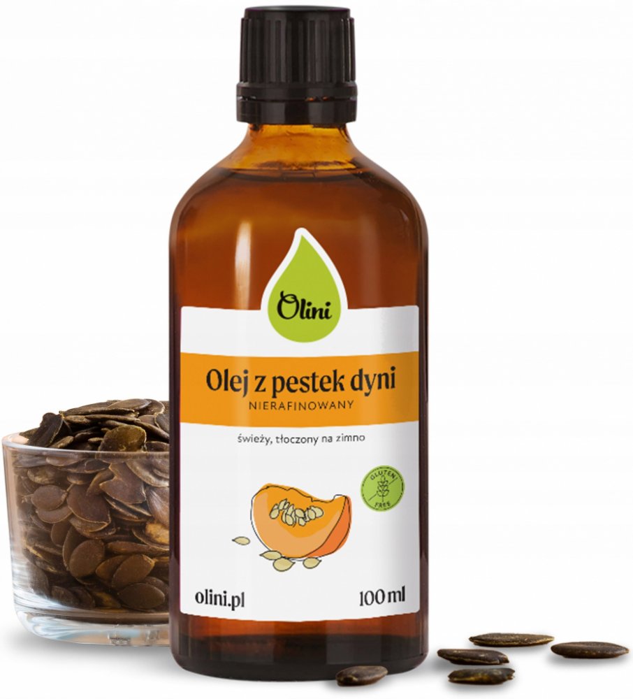 Dýňový olej Olini – lisovaný za studena, z polské dýňových semínek, zdroj nenasycených mastných kyselinDýňový olej Olini – čerstvý, lisovaný ze surových jader, zdroj NNKT ve stravě