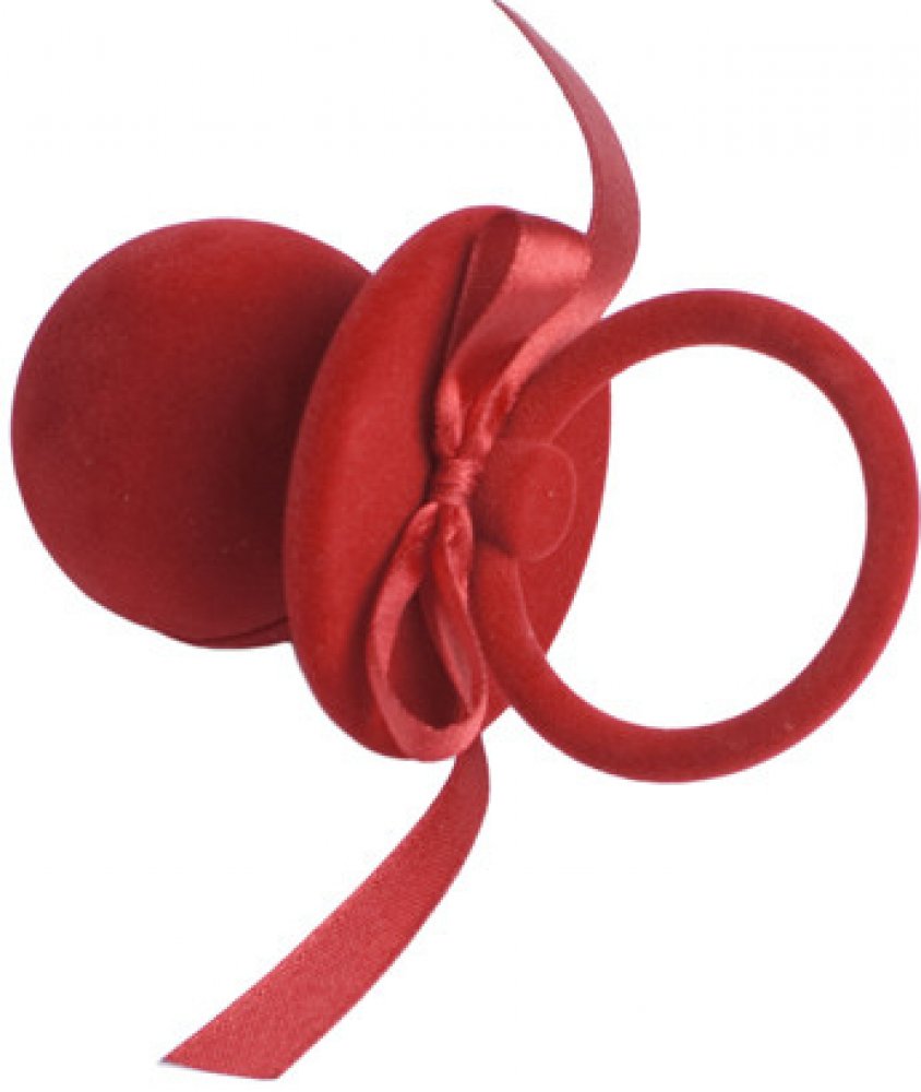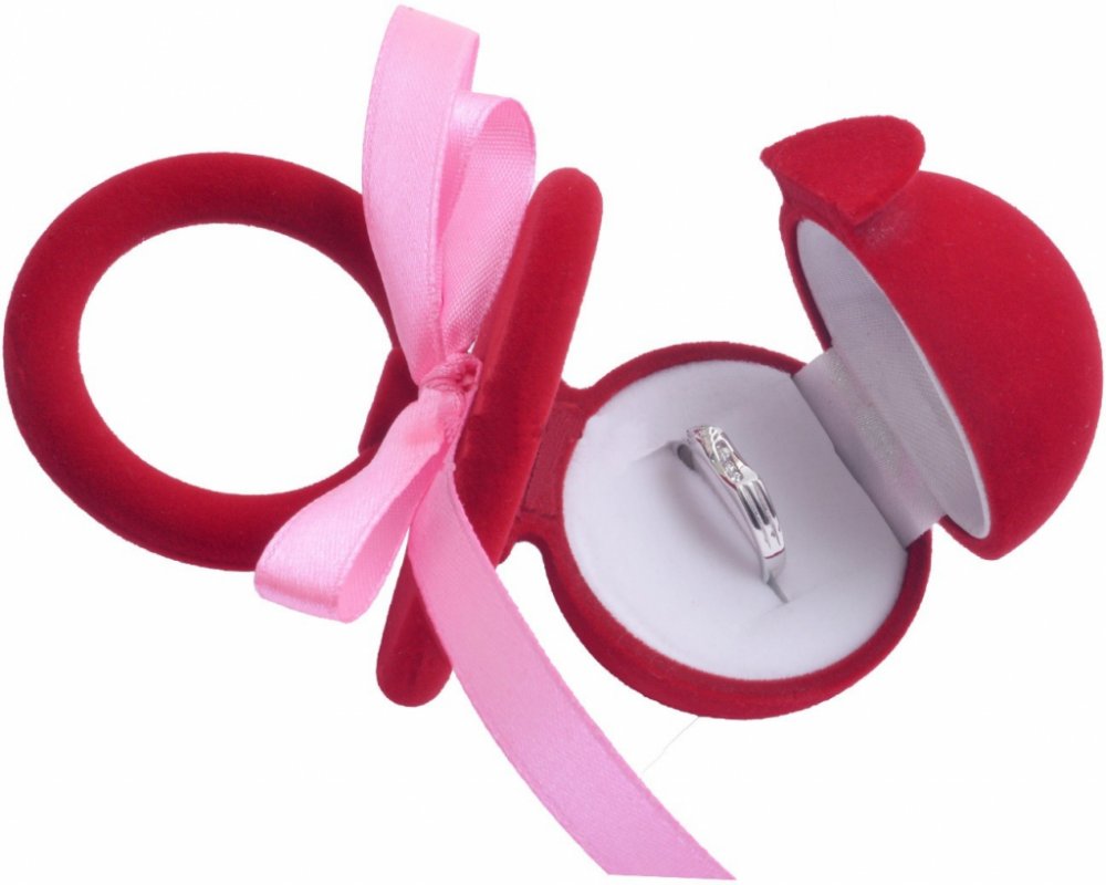 Atypická sametová dárková krabička ve tvaru dudlíku s bílým saténem uvnitř víčka a růžovou mašličkou.